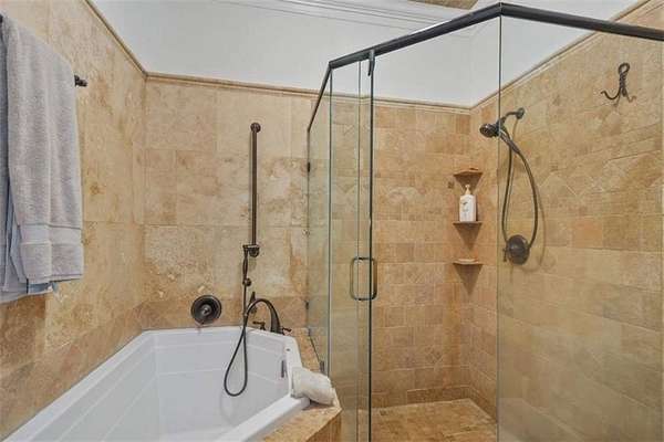 The main-level primary suite provides effortless access to the pool and features a spa-inspired en suite bath with marble floors, classic white subway tile, and a double vanity. Upstairs, four additional bedrooms and baths offer comfortable accommodations, while the third floor reveals a spacious private suite with a sitting and television area, ideal for guests or multigenerational living. The home features five fireplaces, all decorative and not currently functional.