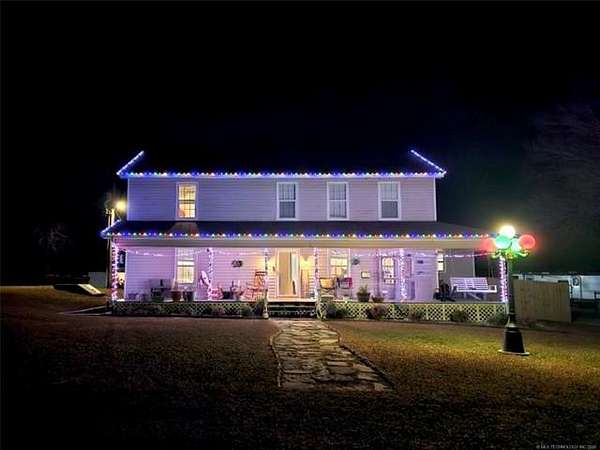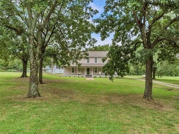 MUST SEE - Stunning 10 acre multi generational estate and income opportunity nestled among mature trees on gently rolling park like land offering privacy flexibility and long term value within easy reach of Muskogee, Eufaula, Bixby, Broken Arrow, Coweta, and Tulsa. The spacious two (2) story main residence features 4 bedrooms with walk in closets in every room, a massive bonus room with sliding barn door, a first floor primary suite, large family room, additional den flex space with French door entry and wheelchair ramp access from the attached carport, and a convenient half bath for guests. Updates include tile in the primary bath and closet, added propane lines to the kitchen, new propane gas oven range, hot water tanks 2022-2023, and a privacy fenced dog run with dog door. Beyond the main home, a beautifully finished barndo style living space built with commercial grade steel studs offers 2 bedrooms, 2 full bathrooms with luxurious jacuzzi soaker tub, floor to ceiling living room windows overlooking a serene meadow and wet weather creek, covered back porch, enclosed side porch, private fenced yard with dog door, tankless water heater, and its own breaker panel and meter. Ideal for multigenerational living, Airbnb, executive rental, or long term income. Another tiny home nearby adds versatility with two rooms, three lofts, a full bath being updated, kitchen with new cabinetry, butcher block countertops and sink, plus its own breaker panel and meter, perfect for guests, studio, office, or rental. The land features a 35x50 barn with two (2) pipe run stalls, water and 220 electric, large indoor whelping pen, 4 outdoor concrete floored whelping pens, 6 stall chicken coop, two(2) RV hookups, abundant storage, and two (2) fully fenced pastures ready for animals, gardening, recreation, or future expansion near scenic countryside, lakes, hiking, outdoor recreation, and VA facilities in Muskogee and Tulsa. Professional photography coming soon. Current images are temporary.