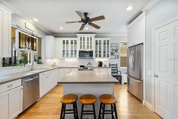 - Built-In Features, Ceiling Fans(s), Crown Molding, Eat-In Kitchen, High Ceilings, L Dining, Primary Bedroom Upstairs, Solid Surface Counters, Solid Wood Cabinets, Thermostat, Walk-In Closet(s), Window Treatments