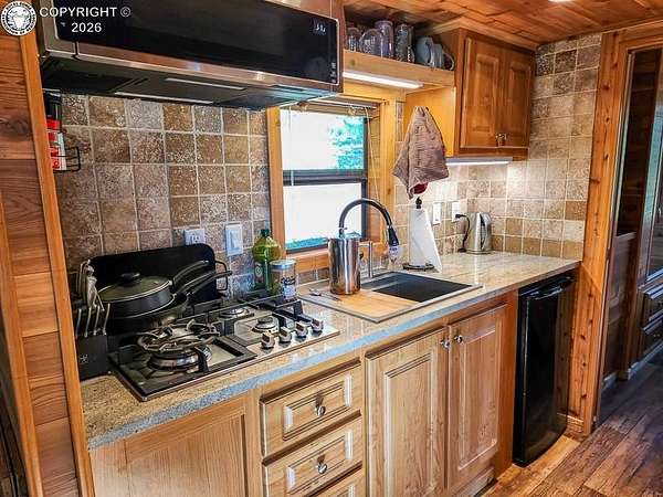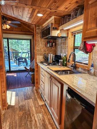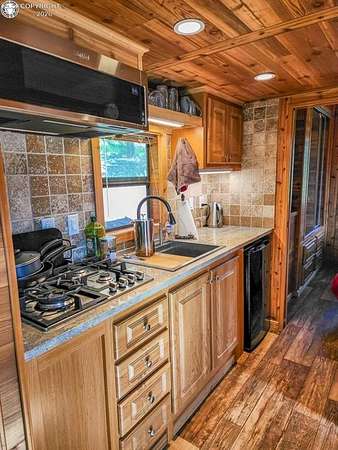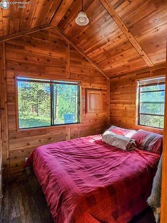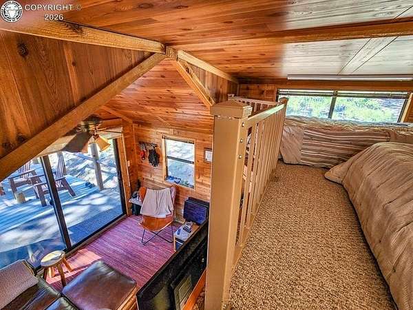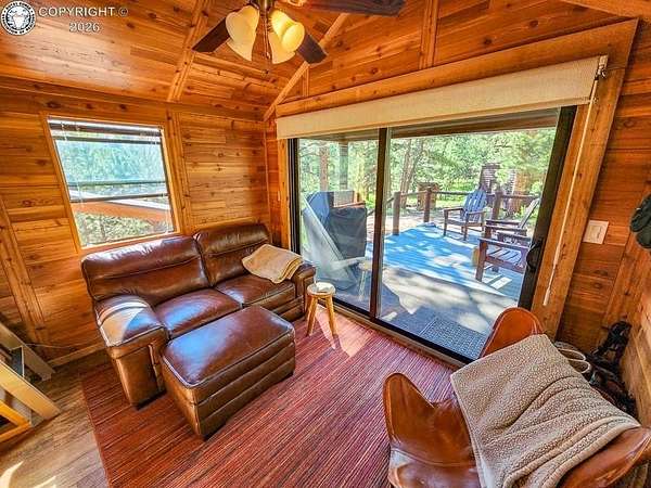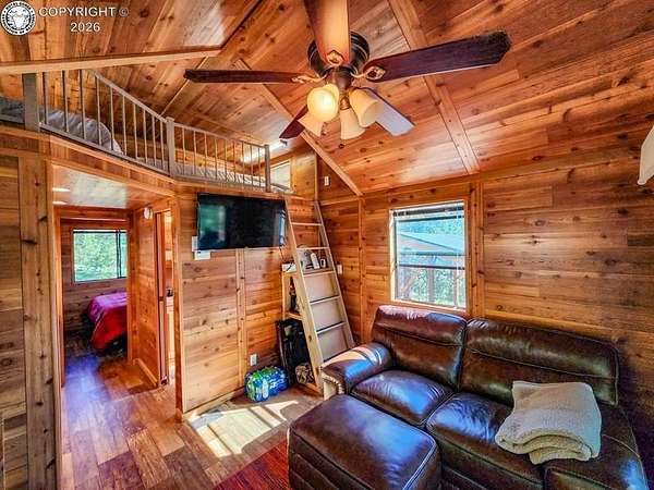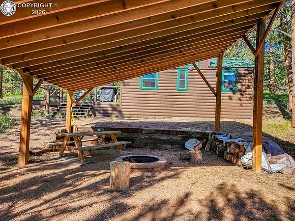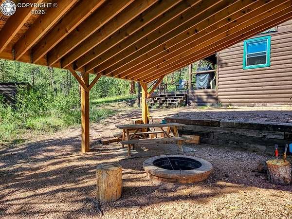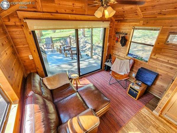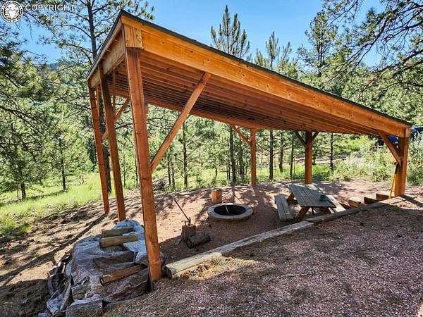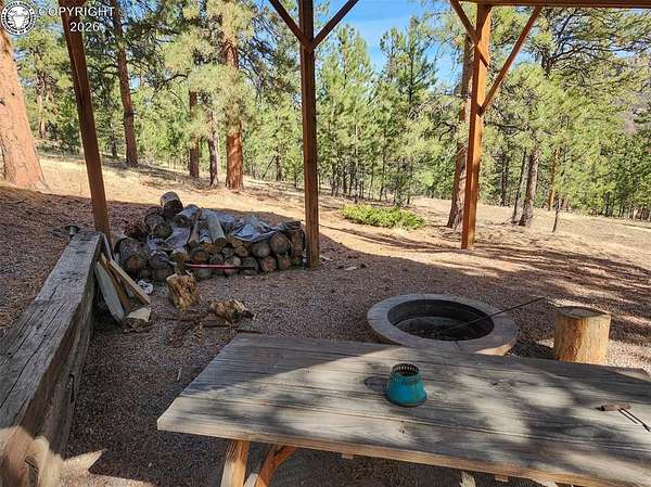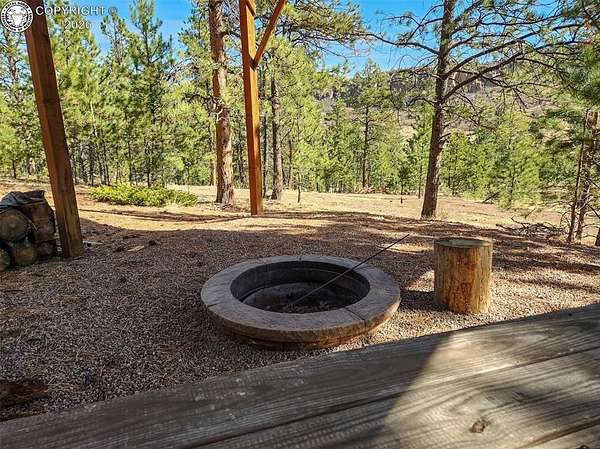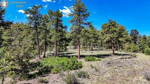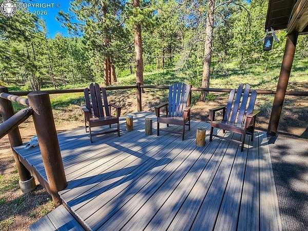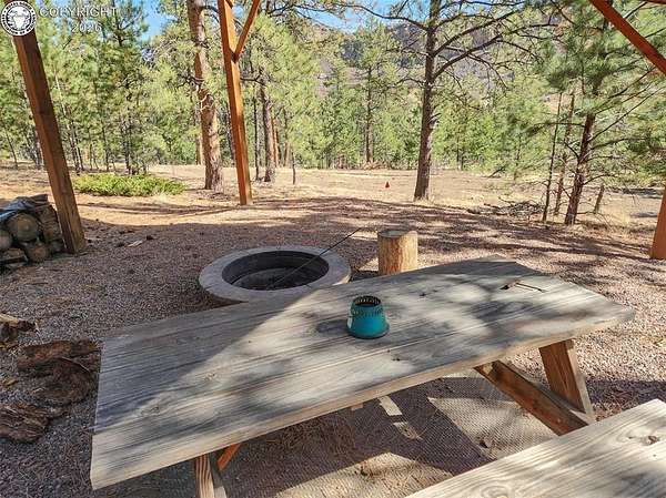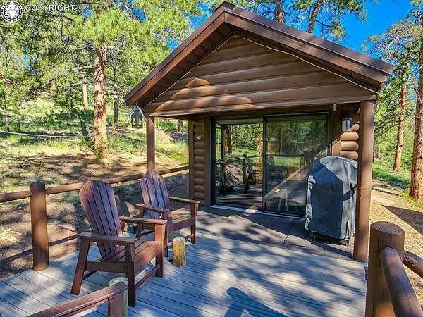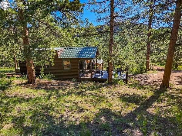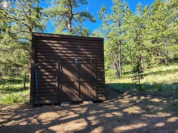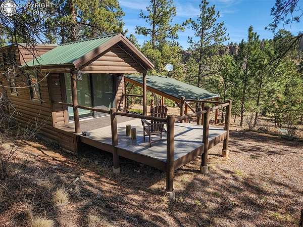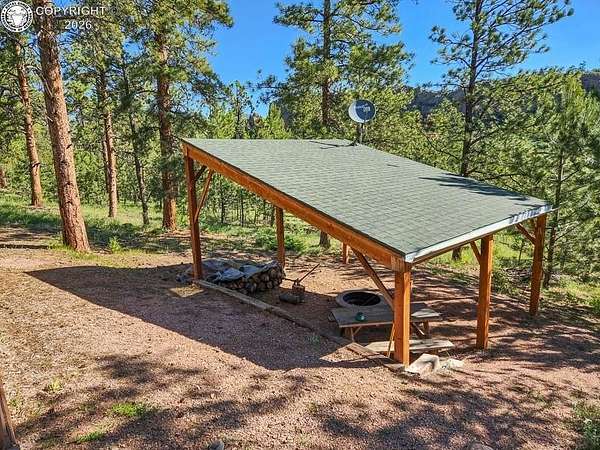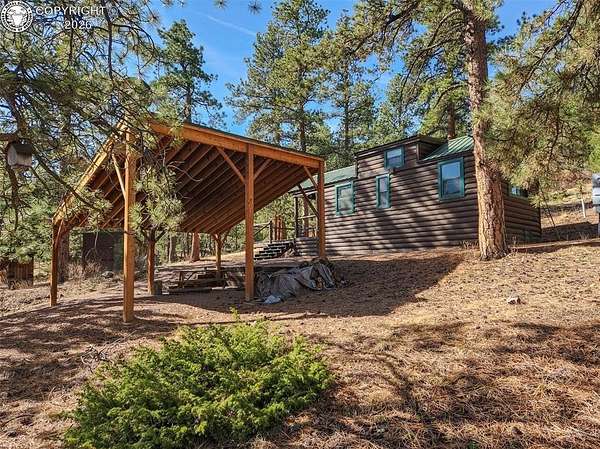 Tucked deep in the tall timber of South T Bar Ranch - a private, gated 5,200-acre community - this meticulously maintained mountain retreat offers 36.48 acres of Ponderosa Pine, Douglas Fir, Blue Spruce, Scrub Oak, and Aspen with sweeping mountain views. The erosion control dam creates a seasonal water source that attracts a wide range of wildlife, including elk, deer, bear, antelope, and more. The Chariot Eagle Park Model RV Series cabin (24x12, 1BR/1BA with sleeping loft) is appointed well beyond its footprint: cedar tongue-and-groove walls and ceilings, granite countertops, gas cooktop, microwave, bathroom with stand-up shower, and sliding glass doors opening to a spacious Trex deck with log railing. The sleeping loft easily accommodates guests, making this an ideal setup for hosting family and friends while you plan and build your dream home - or simply enjoy it as your private mountain sanctuary year after year. Outside, a custom timber-frame covered picnic pavilion with firepit invites evenings under the pines. A 12x14 shed fits a 6-person ATV. A 1,750-gallon cistern and full septic with RV cleanout are in place as well as underground electricity. Located in GMU 58 with year-round road access maintained by the POA, this property offers true four-season enjoyment just 30 minutes from Canon City amenities.