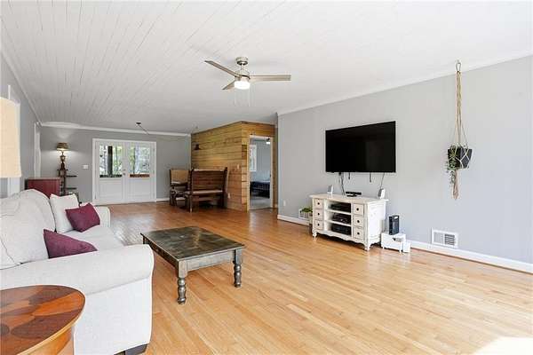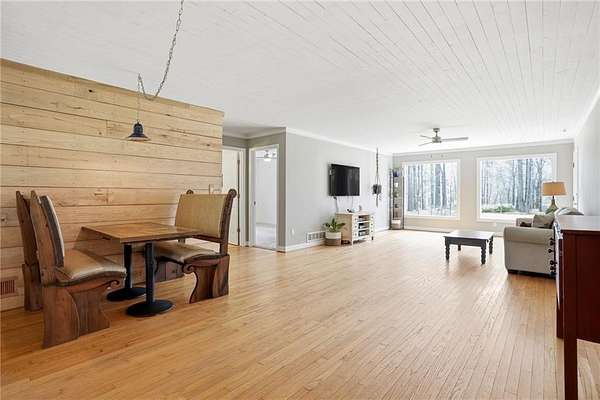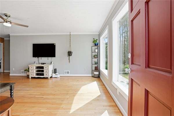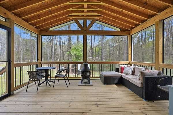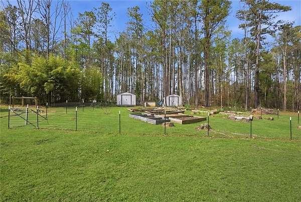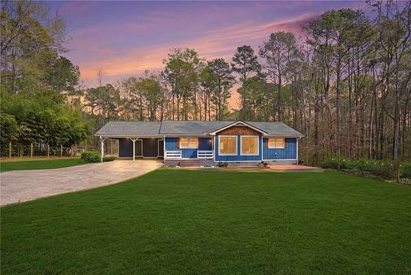 Honey stop the car! This farmhouse chic ranch sits on nearly three private wooded acres just minutes from Senoia and Peachtree City and is located in the highly sought after Sara Harp Minter, Whitewater Middle, and Whitewater High school district. Tucked away at the end of a private drive, the home offers a peaceful setting with a beautifully fenced front yard featuring blackberry bushes and encore azaleas, along with a dedicated fire pit area perfect for enjoying cool evenings with friends and family, enhanced by installed landscape lighting. The expansive backyard provides endless opportunities to garden, play, or enjoy fresh eggs from the custom built chicken coop, and includes raised, preestablished garden beds ideal for organic gardening and growing fruits and vegetables, along with additional berry bushes throughout the property for easy picking and fresh enjoyment. A wooded area with walking and bike trails adds to the charm of this expansive property. The home has been thoughtfully updated with new siding, a new roof, newer HVAC system, fresh paint, and a brand new water heater. Inside you will find an oversized living and dining area with original hardwood floors, an updated farmhouse style kitchen, and a conveniently located laundry room. The layout includes three bedrooms and two bathrooms in a roommate style plan. Step outside the French doors to a stunning screened porch with vaulted wood ceilings, ideal for relaxing and taking in the serene surroundings. This idyllic property has been in the family for generations and showcases pride of ownership, love and attention to the smallest details throughout. It is truly a rare find.