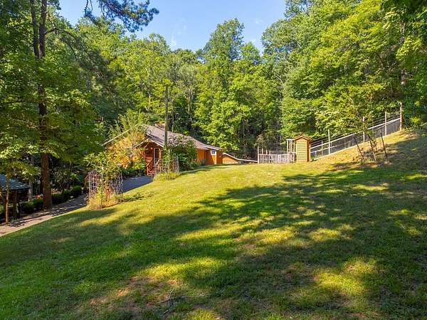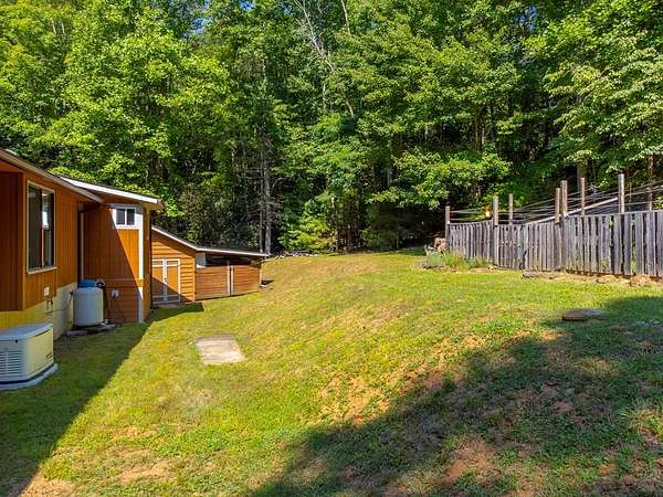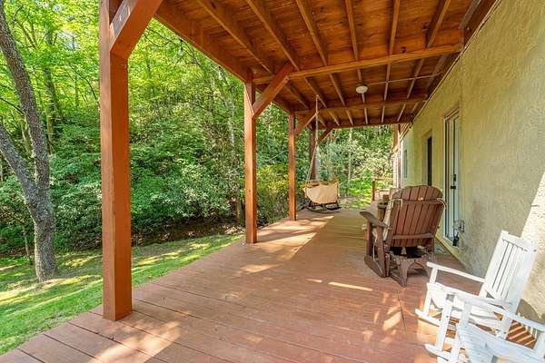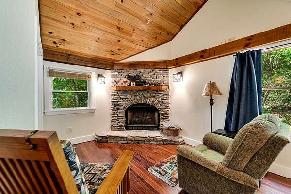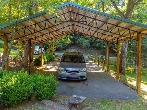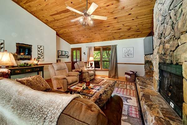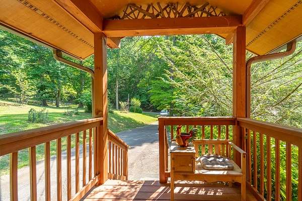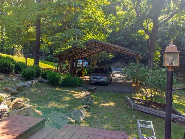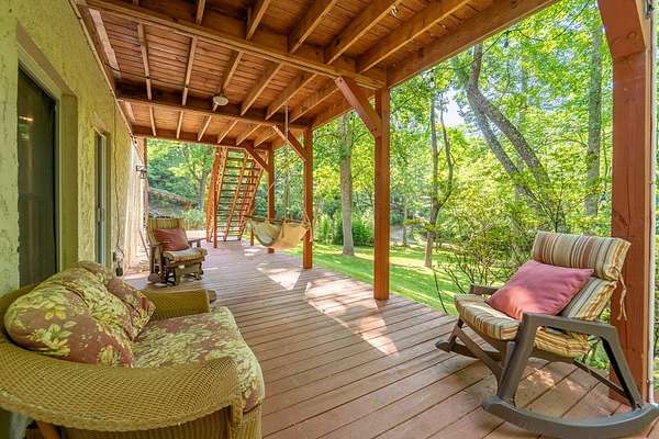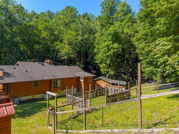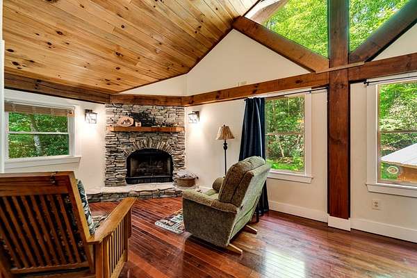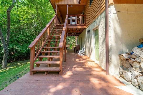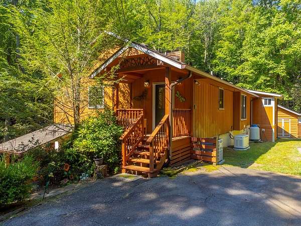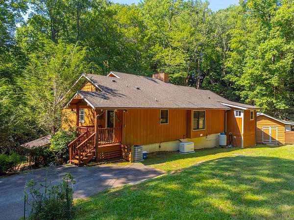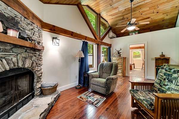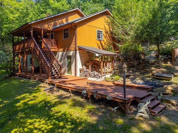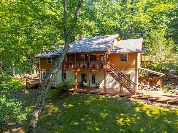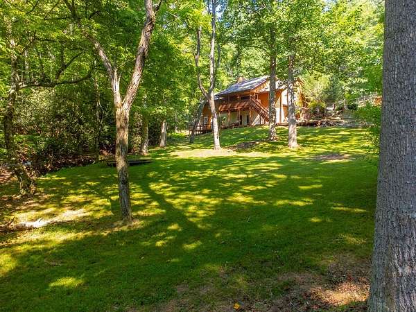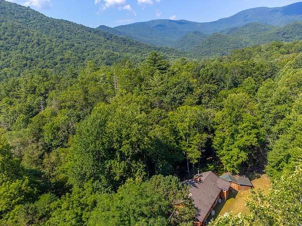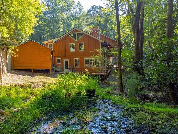 Beautiful Mountain vacation home or full-time home. This home boasts 3 bedrooms, 3 baths, and 3 Bonus rooms just 10 min. to Franklin NC or Clayton Ga. New roof installed in 2018, HVAC in 2023, whole house 24KW generator in 2024, 2 car detached carport with electric in 2024 are just a few improvements to this home. Enjoy living in Heritage Mountain Estates with paved roads and a cascading babbling stream running through your property. 2-large, covered porches to enjoy outdoor entertaining or just relaxing and watch the wildlife. Primary bedroom and ensuite on main level along with 2nd bedroom and bath. Lower level boasts a large Family Room along with 3rd bedroom, 2 additional bonus rooms and 3rd bath.