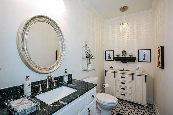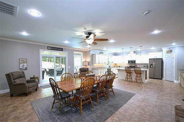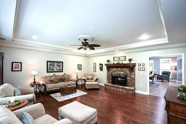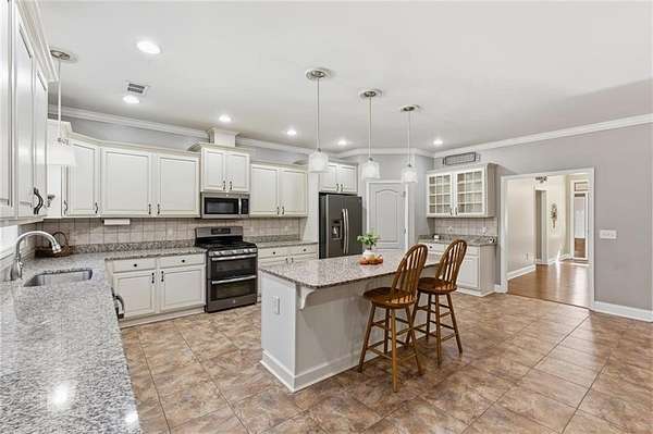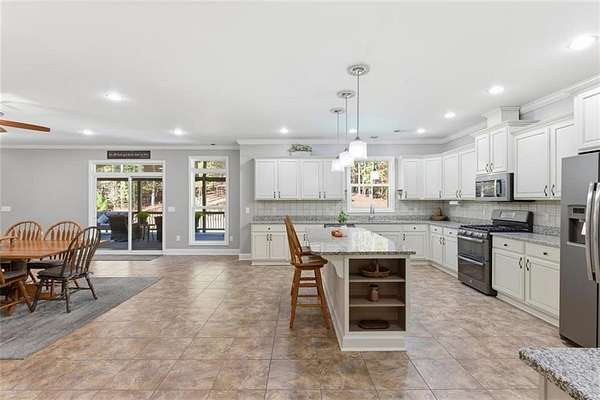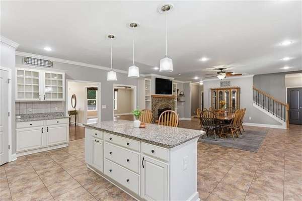 The inviting dining area--large enough to seat up to 15--connects seamlessly to the living spaces with dual see-through brick fireplaces adding warmth and charm. The gourmet farmhouse kitchen includes granite countertops, a center island, stylish backsplash, modern appliances, and an expansive 9x11 butler's pantry with abundant storage.