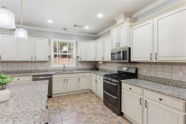 Natural light fills the living room, framed by triple windows overlooking the beautifully landscaped backyard and wooded surroundings. Upstairs, you'll find two additional bedrooms, a full bath, and a large family or playroom with walk-in access to three oversized attic areas for exceptional storage.