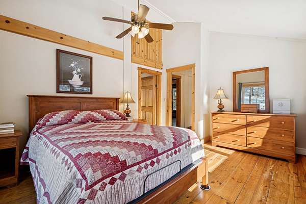 Located in the picturesque town of Strafford, Vermont, near the end of a dead-end road, this home sits on seven acres of land and is only a short drive to the local school, the Strafford General Store, and I-89. This well-maintained home features open-concept living and updated systems, including a new high-yield drilled well, full basement insulation, and a Tesla Powerwall for backup storage. The light-filled first floor includes living, dining, and kitchen areas perfect for gathering, as well as access to two decks. A sunken first-floor bedroom offers versatility for use as an office or family room. Upstairs, you will find a master bedroom, a second bedroom, an oversized full bathroom, and a cozy reading nook. Do not miss the chance to view this property and all it has to offer.