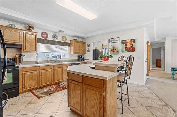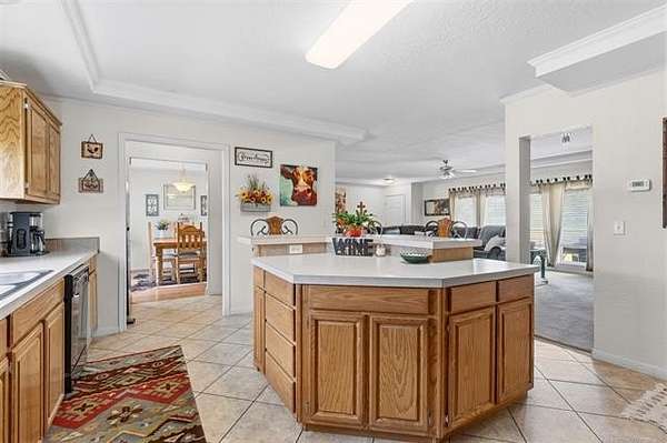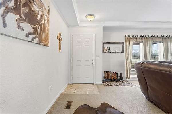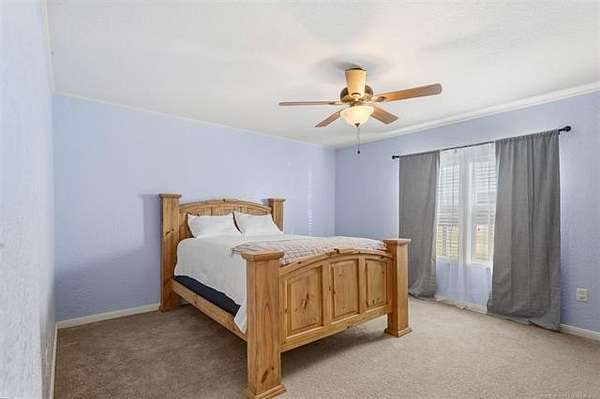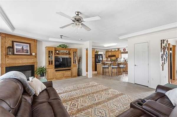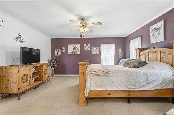 Situated on 3.75 acres, this 2011 Solitaire mobile home offers 3 bedrooms and 2 baths with space, comfort, and great features throughout. Enjoy the big covered front porch-ideal for relaxing or entertaining. Inside, crown molding adds a nice touch, along with an abundance of cabinets and storage. The primary suite features a huge walk-in closet and a spacious bath with a whirlpool tub and walk-in shower. You'll also love the large utility room with mud sink. Outside, you'll find a new roof (2025), a 3-car carport, and a large storage building with concrete floors and electricity. The home features a permanent foundation, making it eligible for all financing types.