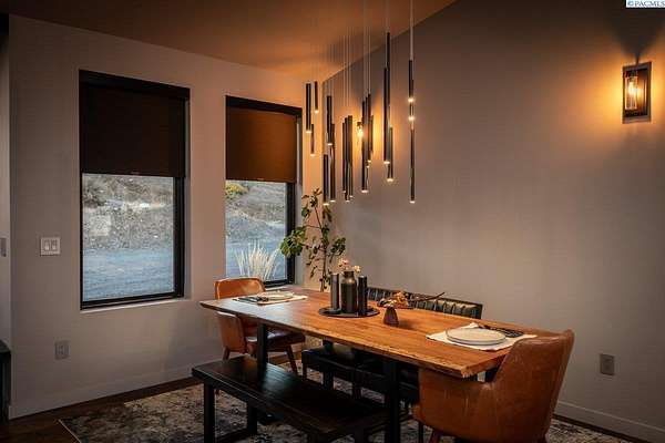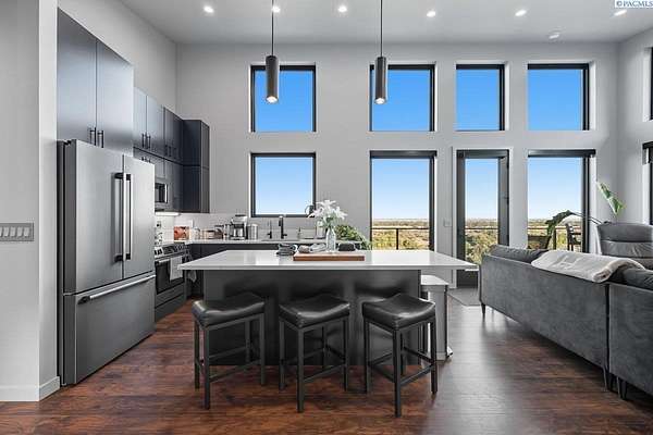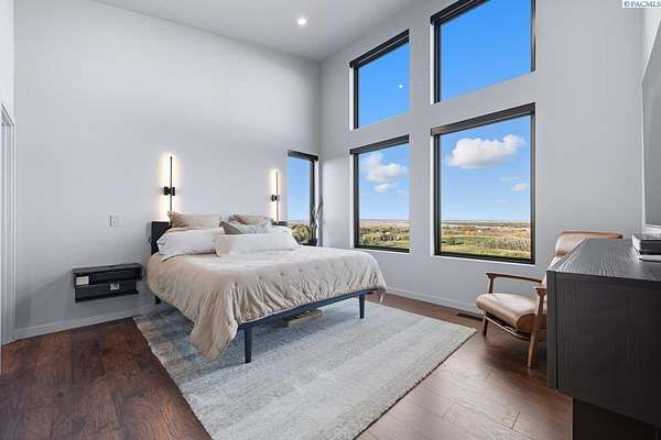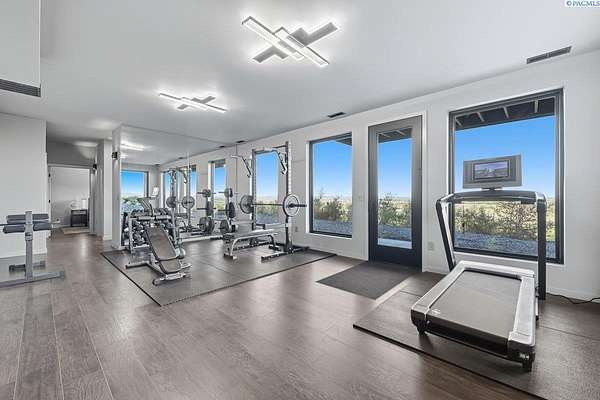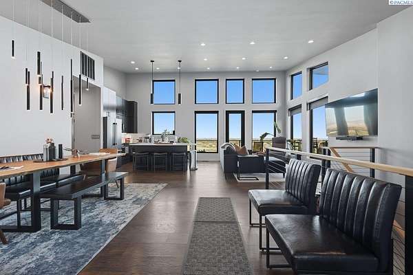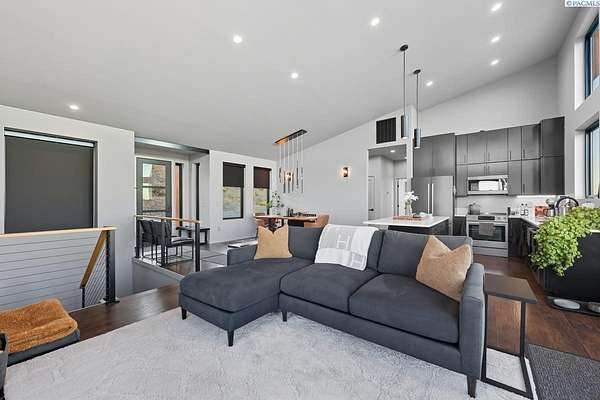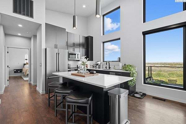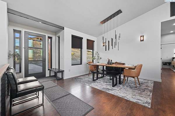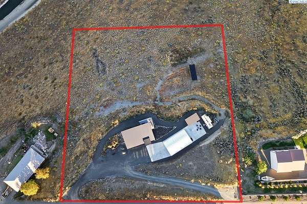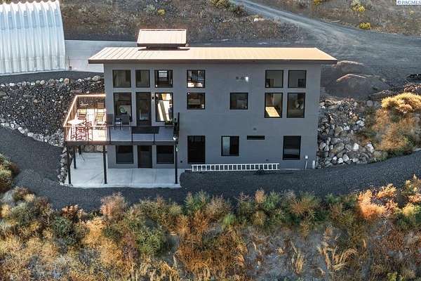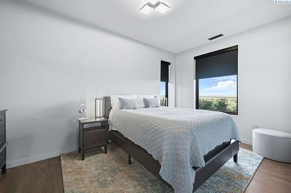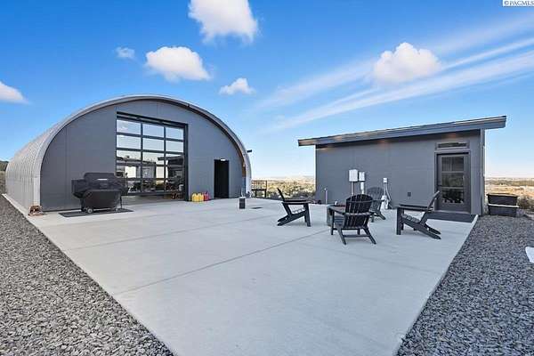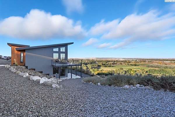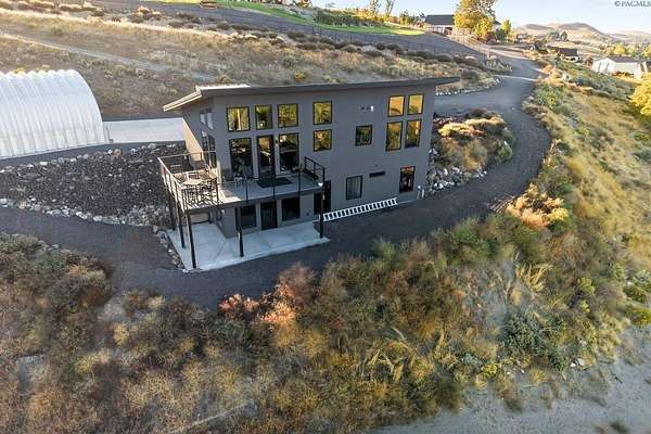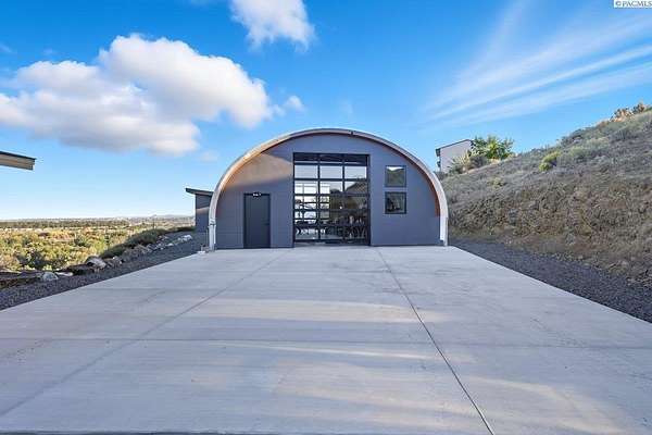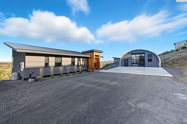 MLS ID 292117: Discover modern Pacific Northwest luxury on 2.5 serene acres at The Ridge in West Richland. This 2,401 sq ft nearly net-zero estate features an 8 kW ground-mount solar system and breathtaking 235° views of the Yakima River, canal, and hills. Inside, natural hardwood and tile floors flow throughout, complemented by marble and granite counters and fully tiled baths/showers. The chef’s kitchen offers quartz surfaces, premium appliances, and an oversized island, while the primary suite includes a spa-style bath and walk-in closet. A dedicated gym/wellness area, three baths, and open living spaces with abundant light complete the home. Outside, enjoy expansive decks, eco-friendly xeriscaping options, and unique amenities: a massive Quonset hut shop with glass drive-through doors plus a detached, HVAC-controlled office. Expansion plans allow two additional bedrooms, a sauna, and an outdoor kitchen. See attached sketches for next-phase options, including an additional EV garage. A rare blend of privacy, sustainability, and luxury—just minutes from town.
