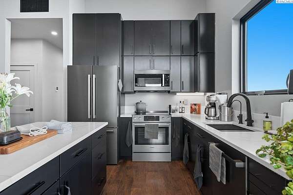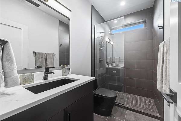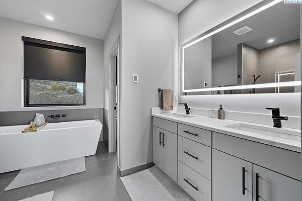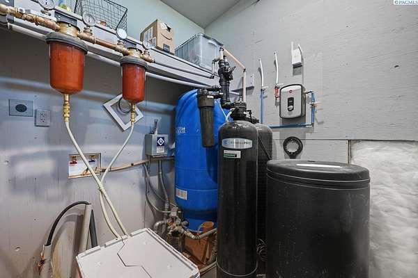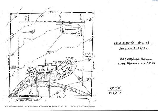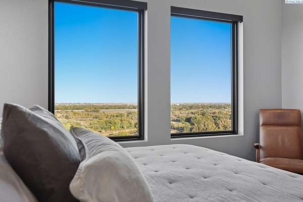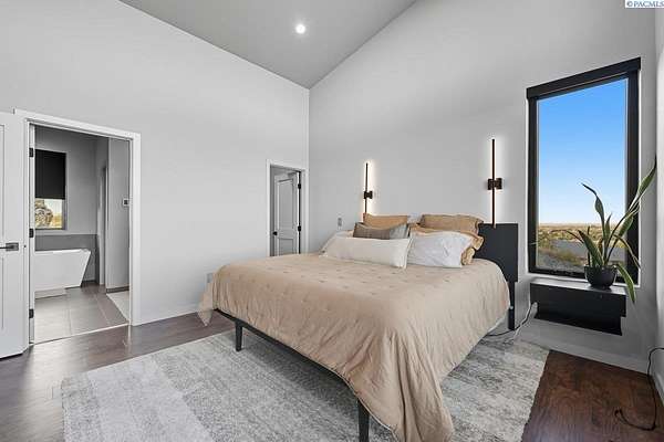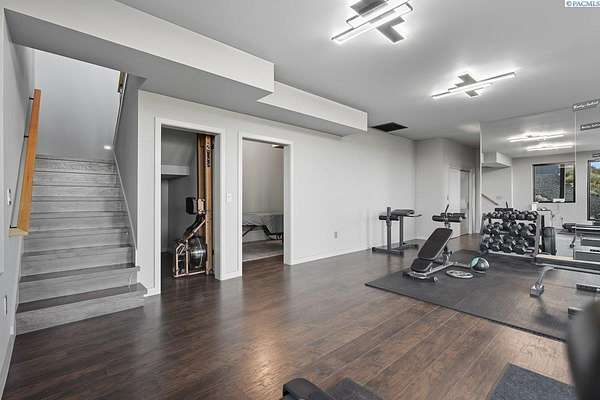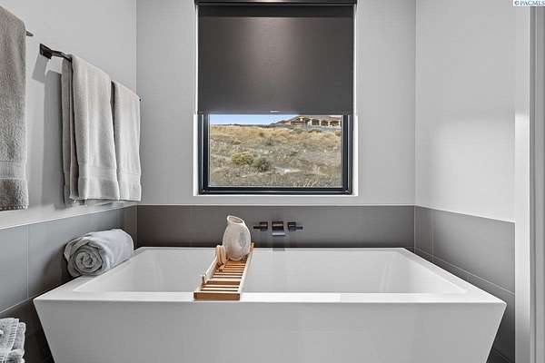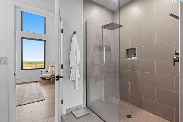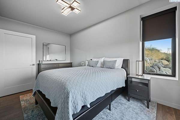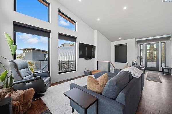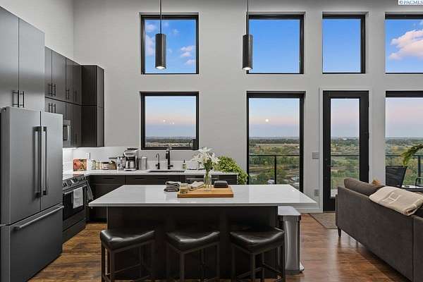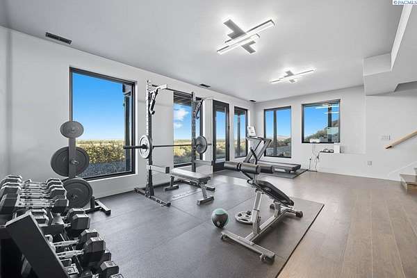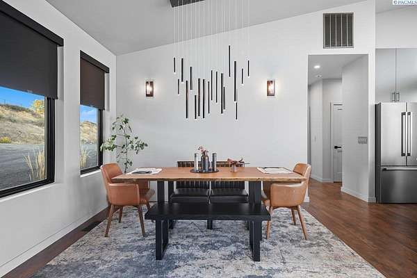 MLS ID 292117: Discover modern Pacific Northwest luxury on 2.5 serene acres at The Ridge in West Richland. This 2,401 sq ft nearly net-zero estate features an 8 kW ground-mount solar system and breathtaking 235° views of the Yakima River, canal, and hills. Inside, natural hardwood and tile floors flow throughout, complemented by marble and granite counters and fully tiled baths/showers. The chef’s kitchen offers quartz surfaces, premium appliances, and an oversized island, while the primary suite includes a spa-style bath and walk-in closet. A dedicated gym/wellness area, three baths, and open living spaces with abundant light complete the home. Outside, enjoy expansive decks, eco-friendly xeriscaping options, and unique amenities: a massive Quonset hut shop with glass drive-through doors plus a detached, HVAC-controlled office. Expansion plans allow two additional bedrooms, a sauna, and an outdoor kitchen. See attached sketches for next-phase options, including an additional EV garage. A rare blend of privacy, sustainability, and luxury—just minutes from town.