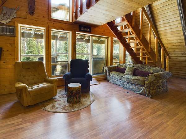 Constructed in 1976, the primary A-frame cabin showcases enduring quality with its concrete slab foundation, wood siding, and a durable metal roof. This unique architectural design not only stands out visually but also blends beautifully with the natural landscape. The inviting interior features warm wood plank floors that perfectly capture the essence of a cozy mountain cabin, where every corner inspires relaxation. Large windows invite in ample natural light, allowing you to enjoy serene views and sunsets from inside the warmth of your home.