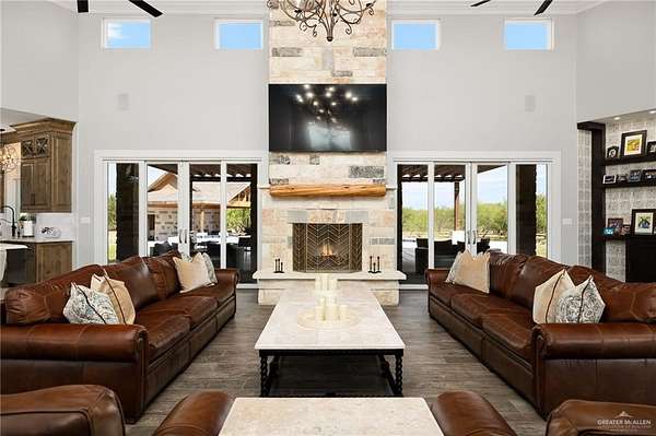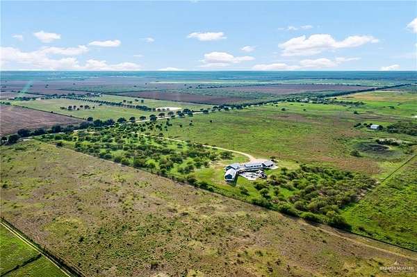 Set on 50 acres in N. Edinburg, this 9,600 sq ft custom estate offers refined living just 2 miles east of I-69 and near South Texas Int'l Airport. Designed in a coastal modern farmhouse style, it features 4 bedrooms w/ lofts (one can be converted into another room or office), 5.5 baths, office, gym, theater, and a 4-car garage w/ custom cabinetry and full bath. Each bedroom has private outdoor access, blending comfort with nature. The chef's kitchen includes dual Sub-Zero fridges, Wolf ovens, steam oven, 2 islands, wine fridge, warming drawers, 2 dishwashers, and a walk-in pantry. A 400-bottle wine cellar adds to the entertainer's dream. Interiors showcase light gray tones, reclaimed wood, crown molding, custom millwork, and vaulted ceilings. The home sits on 20 manicured acres, with 30 additional acres at the north end. Foam insulation, gas/electric appliances, dual gas/wood-burning fireplace, and private water well offer comfort, style, and efficiency.