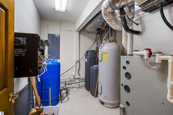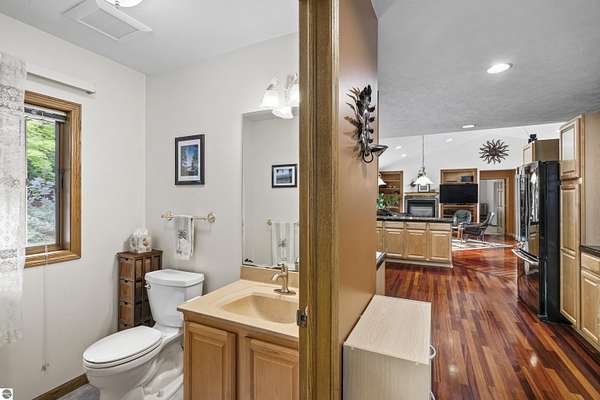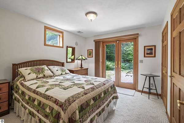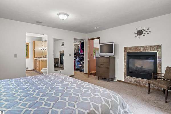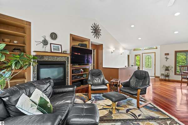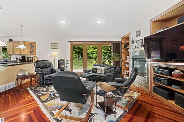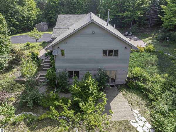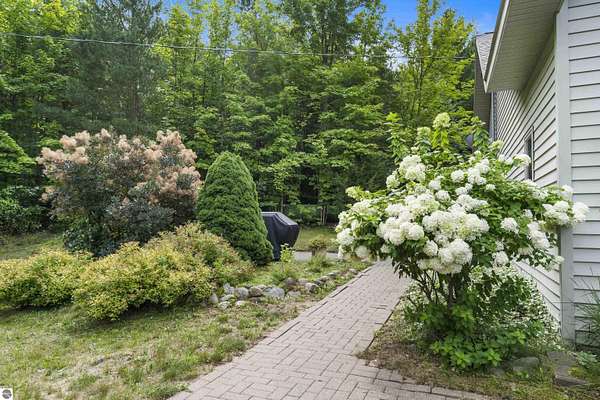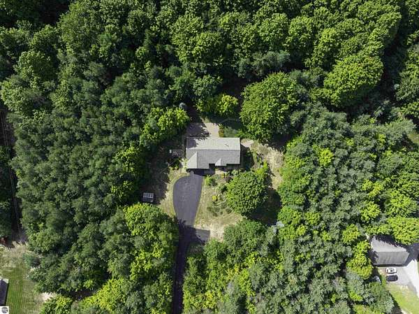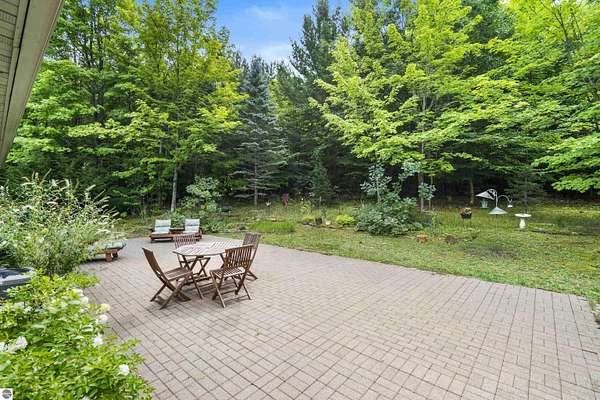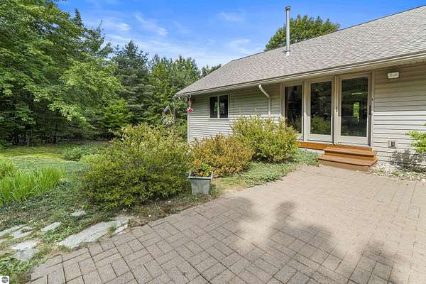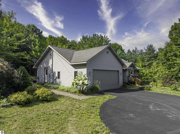 Nestled in a private wooded setting with nearly 6 acres. This well cared for ranch style home offers the perfect balance of comfort, privacy and peacefulness. Step inside to an inviting open living, dining, kitchen area featuring Brazilian Cherry hardwood floors and a cozy two-sided fireplace that warms both the living room and the primary bedroom with private bathroom suite. This 4 Br 2.5 bath home includes main floor laundry room for everyday ease. The lower level provides 2 additional bedrooms including a walkout, making it ideal for guests, family and a non conforming bedroom for flexible use. Enjoy the outdoors on the expansive brick pavered patio, where you can take in the beauty of nature right at your doorstep. Additional highlights include a GENERAC system for peace of mind and a garden shed for added storage. All this and more! Located near Interlochen and only 30 minutes from downtown Traverse City.
