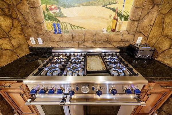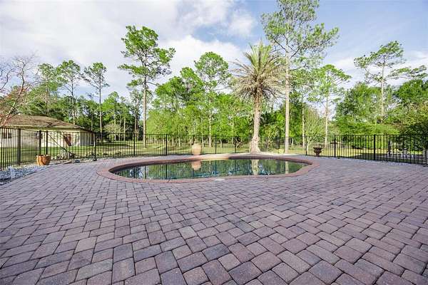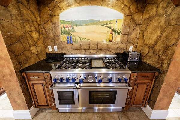 Extraordinary Mediterranean Revival estate set on 10 private acres, offering timeless architecture and refined craftsmanship. This over-7,000 sq ft residence welcomes you through a sweeping motor court with fountain, framed by classic stucco, clay barrel tile roofing, and deep arched loggias.The interior features expansive living spaces with soaring ceilings, stone flooring, rich wood accents, and abundant natural light with serene courtyard views. The chef's kitchen is designed for entertaining with custom cabinetry, an oversized island with seating, and striking pendant lighting. The primary suite is a private retreat with tray ceilings, a spa-inspired bath featuring dual vanities, a jetted soaking tub, and an oversized walk-in shower with rain head and multiple body sprays. Multiple custom walk-in closets with built-in cabinetry provide exceptional storage. Library, 3 car garage, and outdoor kitchen all add versatility to this unique property. Other outdoor amenities include an in-ground pool and a tranquil meditation pond, enhancing the property's resort-like feel. A separate approx. 1,800 sq ft guest house, along with horse stables and paddocks, completes this equestrian-ready estate--ideal for multi-generational living, guests, or staff. A rare offering combining architectural integrity, privacy, and lifestyle versatility.