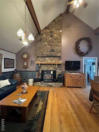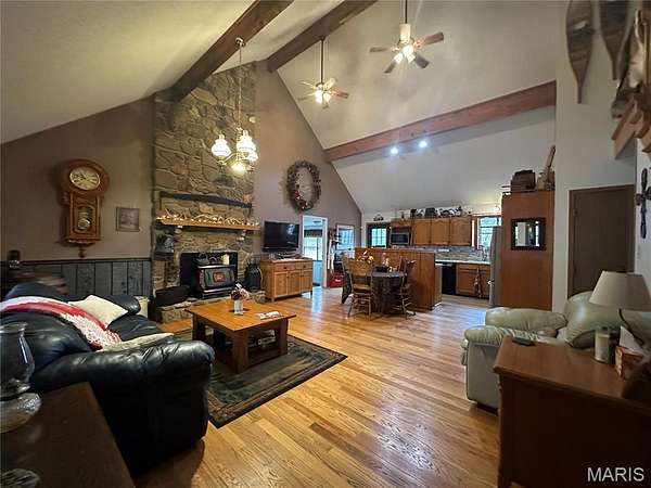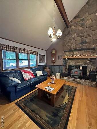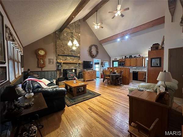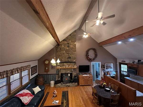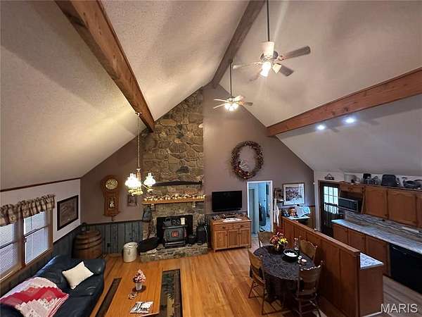 COUNTRY ROAD LEAD ME HOME - to this Rustic 4-Bedroom home with workshop in a private country setting. This rustic 4-bedroom home offers a spacious open floor plan with soaring vaulted ceilings and warm, inviting finishes throughout. At the heart of the living room, a stunning floor-to-ceiling stone wood-burning fireplace creates the perfect cozy focal point for gatherings and quiet evenings alike. The kitchen comes fully equipped with appliances, and main floor laundry adds everyday convenience. The primary suite provides a peaceful escape, complete with ample closet space and a private en-suite spa bath & separate shower & bidet. Additional living space on lower level., great for entertaining. There is also an abundance of storage. Step outside to enjoy a large deck and patio--ideal for relaxing or entertaining. A two-car attached garage is paired with a tuck-under garage on the lower level for additional storage and flexibility. A dream for hobbyists or small business owners, the 30x40 workshop features concrete floor, 220 electric, and oversized overhead doors. All of this is nestled on 10 scenic acres, offering peace, privacy, and endless potential.
