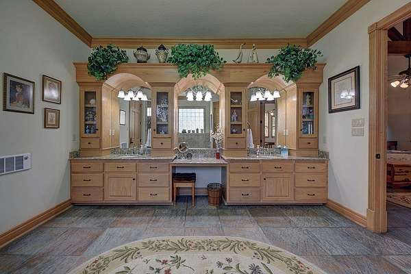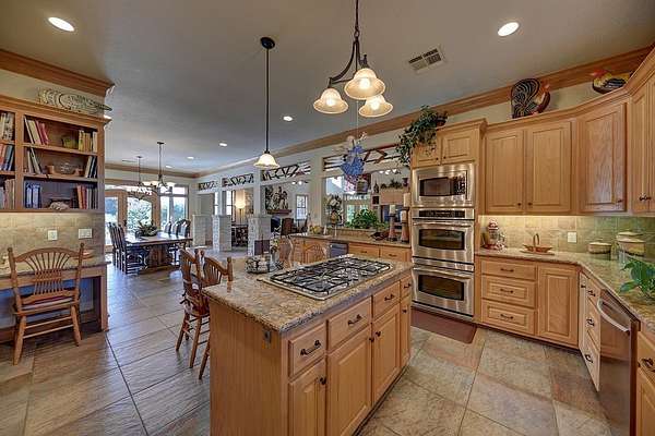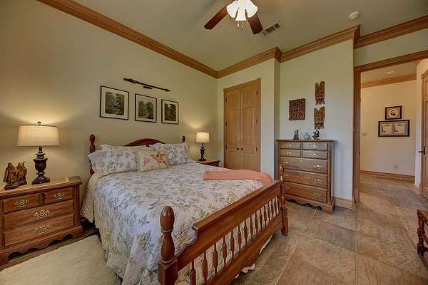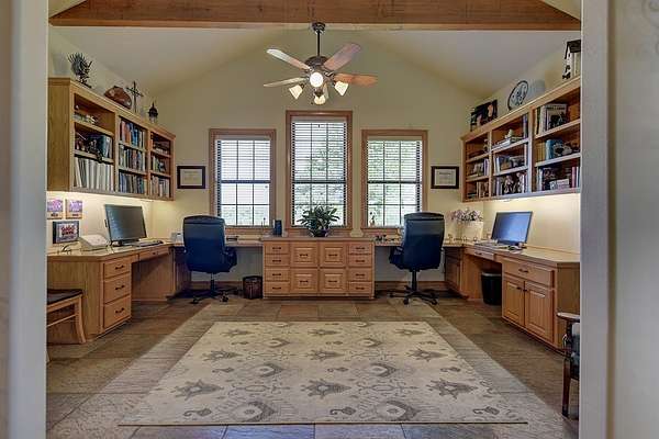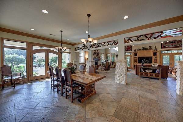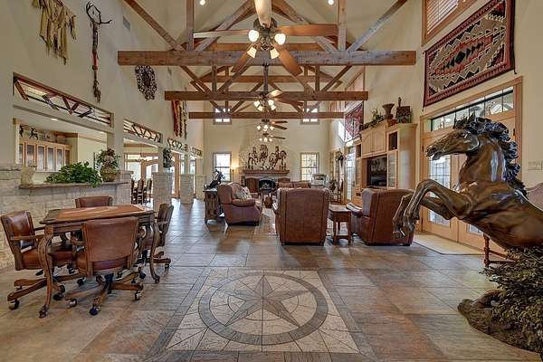 Inside, the open-concept great room impresses with soaring cathedral ceilings, exposed wood beams, and a floor-to-ceiling limestone fireplace. Three sets of double doors fill the space with natural light and open to expansive outdoor living areas perfect for entertaining. Additional highlights include an elegant entryway with custom tile flooring, a spacious dining room, an entertainer?s kitchen, and a luxurious primary suite with sitting room, double-sided fireplace, home office, and an en-suite bath featuring his-and-hers walk-in closets. Two additional bedrooms and a versatile flex room complete the main home.