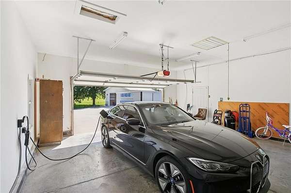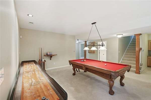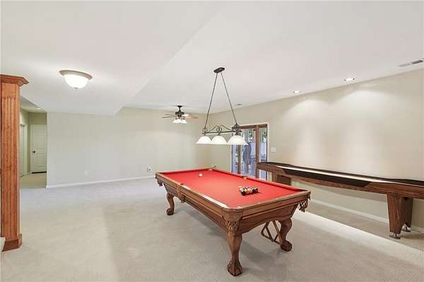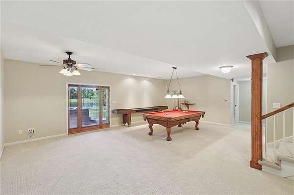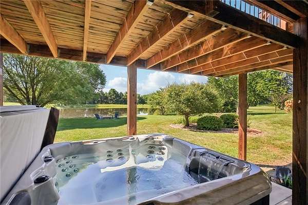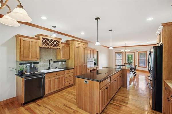 This stunning home is designed for both comfort and entertainment, set on a generous almost 3 acre lot that offers plenty of space for outdoor activities. As you enter the home, you're greeted by a spacious foyer that leads into the inviting living room area where you'll find a double sided fireplace and large windows that bathe the space in natural light and provide beautiful views of the backyard space. In the kitchen you will find ample counter space, an oversized island, and a walk in pantry. Adjacent to the kitchen is a spacious dining area which is where you will find a doorway to the large deck making it ideal for everyday meals and entertaining. The large deck extends the living space outdoors, offering a perfect spot for morning coffee, summer barbecues or peaceful evenings overlooking the pond. Each of the five bedrooms is generously sized and equipped with walk-in closets, providing plenty of storage and personal space. The primary suite is a true retreat with double doors leading onto the deck, complete with an en-suite bath featuring a jetted tub, separate shower, and dual vanities. The walkout basement is a true highlight with a large family room equipped with a pool table and a shuffleboard to supply extra entertainment for any occasion. A kitchenette adds convenience for snacks and refreshments. This area includes a patio with a hot tub where you can unwind after a long day. For those who need extra space for hobbies or storage, the home features 3 garage spaces, one with an EV charger and a shop with extra space for vehicles, tools, or even a workshop. The outdoor space is equally impressive, with fruit trees, and a large stocked pond, ideal for fishing or simply enjoying nature on the dock. The expansive yard offers plenty of room for gardening, outdoor gatherings, or recreational activities.
