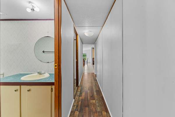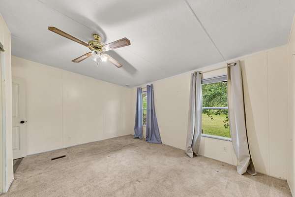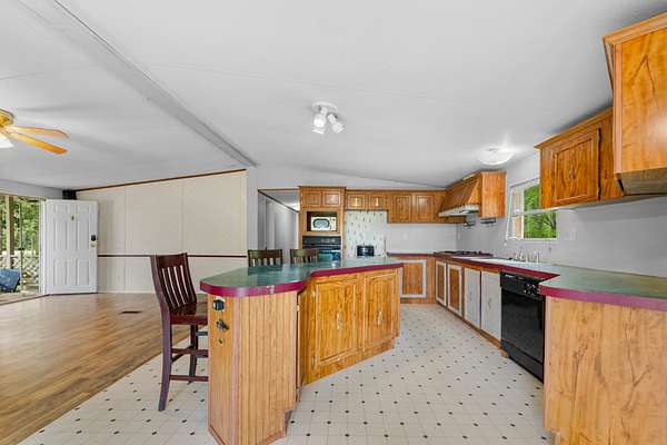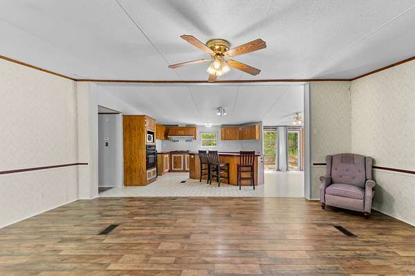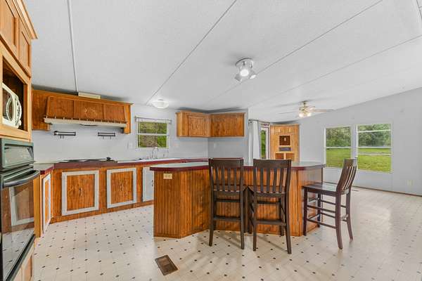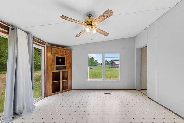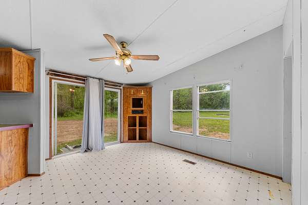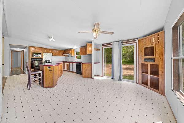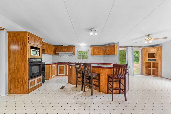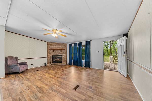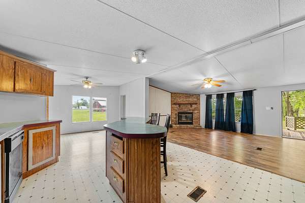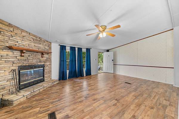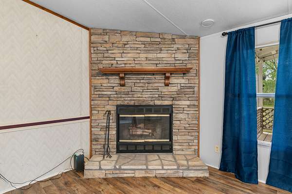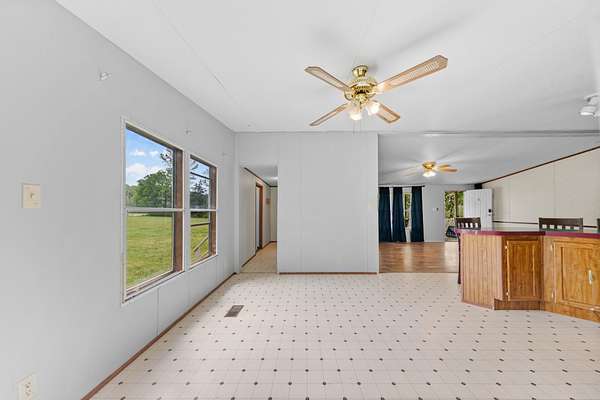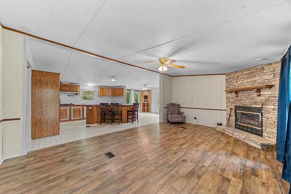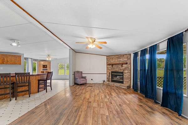Peaceful Country Living on a 5.74 Acre Mini-Farm w/Spring fed Pond! This 3 Bdrm/2 Bath (1508sqft) Manufactured Home offers a Spacious, Open-Concept Layout with a Large Living Area, Cozy Stone Fireplace, and Abundant Natural Light. The Kitchen features plenty of Cabinet space, Bar seating, and a Functional layout perfect for everyday living or entertaining. Side Entrance to a Separate Laundry/Mud Room with Washer & Dryer Remaining. And appreciate the Brand New PEX Plumbing installed Underneath. PLUS….HIGH SPEED INTERNET (ML-Connect)!!!