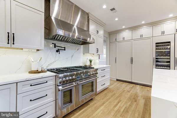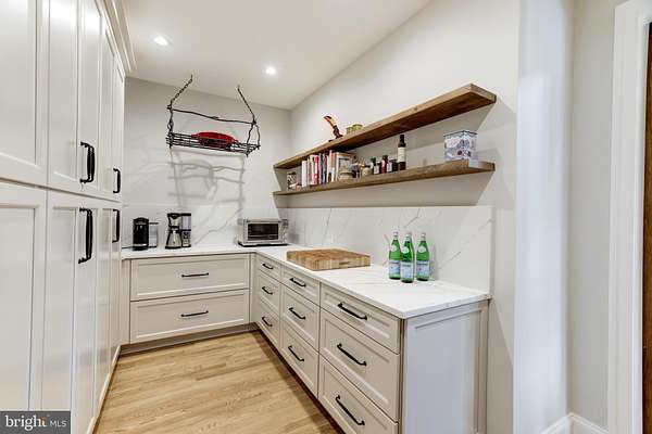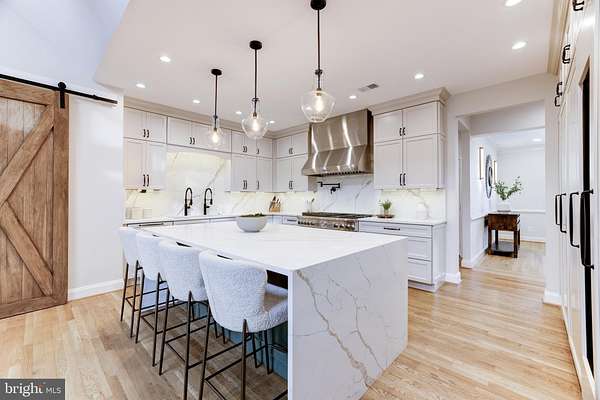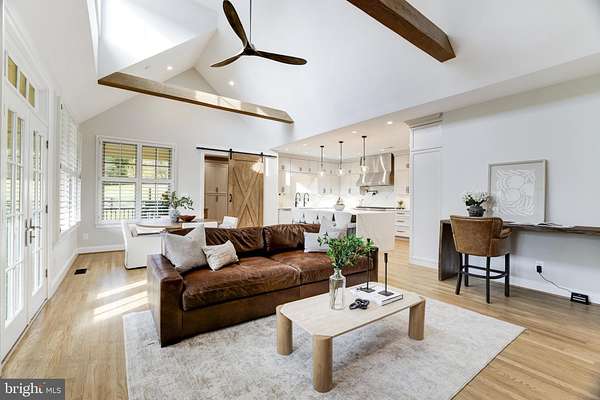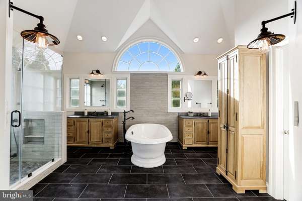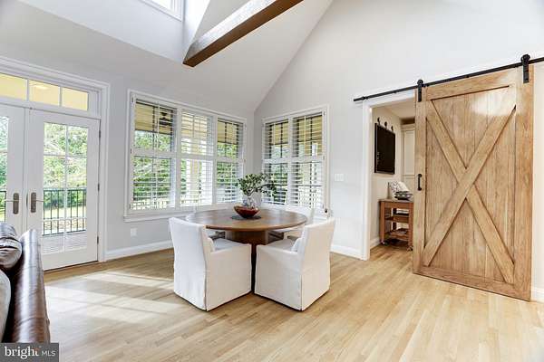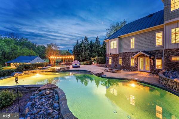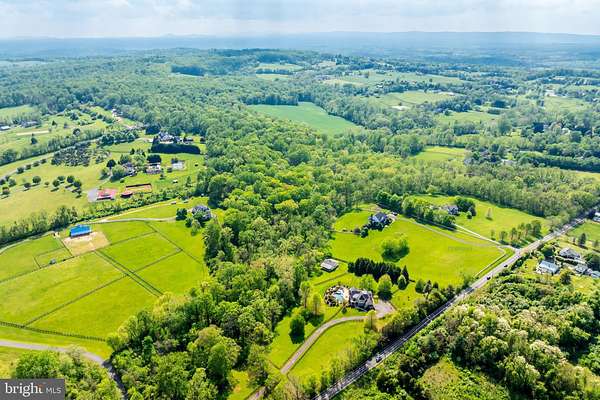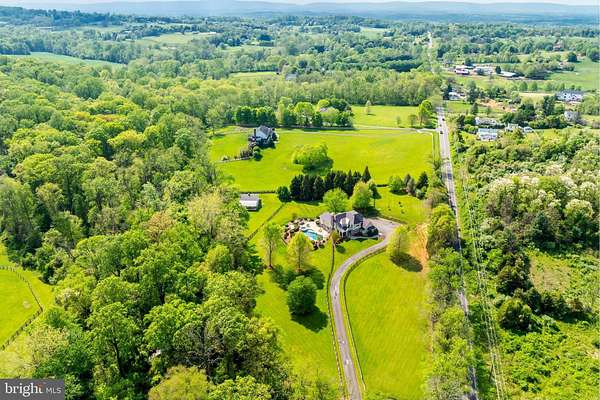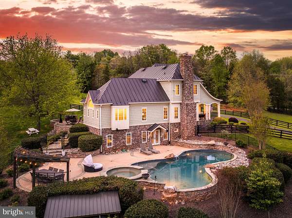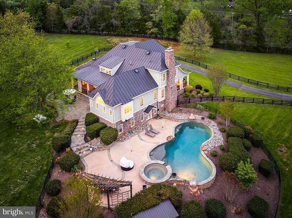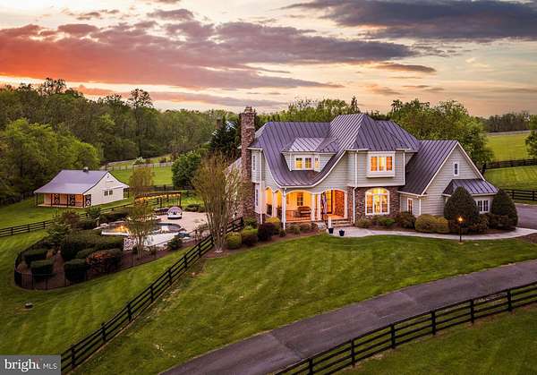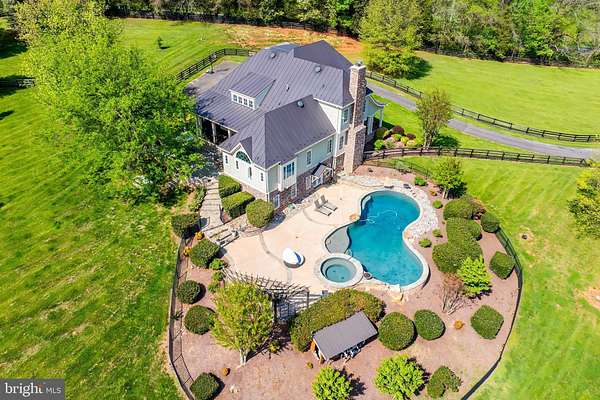 Welcome to Skyfall, a custom-built modern farmhouse thoughtfully designed with the finest materials, exuding sophisticated luxury on 9.08 meticulously fenced acres secured by private electric-gate access. Nestled on prestigious Peale Lane-a secluded enclave celebrated for estate-quality homes amid Loudoun County's picturesque wine country-Skyfall offers exceptional privacy, yet is mere minutes from vibrant downtown Leesburg. Crafted with impeccable attention to detail, the home's striking entry features imported black French steel doors beneath a dazzling Schonbek German crystal chandelier, accented by tray ceilings and crown molding throughout the main level. Durable Hardi-plank siding, a sleek full metal roof, and new Carrier HVAC systems with UV technology underscore the superior quality of construction. The luxurious main-level primary suite includes dual walk-in closets, French steel doors, and a cozy sitting area with a Jotul wood stove surrounded by marble. Its opulent ensuite bath features reclaimed barn doors, cathedral-arched windows, an oversized Kohler soaking tub, Toto Japanese toilet, dual Indian marble vanities, and frameless rainfall shower. Two chic powder rooms-including one concealed within the laundry-ensure convenience. Ascend the dramatic waterfall staircase to three spacious bedrooms, each with generous walk-in closets. One bedroom has a private ensuite bath with marble vanity; the other two share a Jack-and-Jill bathroom with dual Carrera marble vanities, clawfoot tub, and seamless glass shower. A charming reading nook completes the upper level. The gourmet kitchen impresses with expansive floor-to-ceiling cabinetry, waterfall quartz island with cabinetry on both sides and integrated power, WiFi-enabled Thermador appliances including discreetly integrated fridge, freezer, dishwasher, wine fridge, 6-burner range with griddle, twin ovens and integrated Chef's hood.. Under-cabinet lighting, hidden outlets, and a trough sink with dual faucets enhance functionality. An adjacent hidden pantry mirrors kitchen finishes with quartz counters and open English oak shelves, and handmade hickory barn door entrance. The expansive family room features soaring cathedral ceilings, exposed wood beams, rustic stone fireplace insert, built-in English oak workspace, and access to the wraparound porch. A formal dining room, illuminated by a statement fixture, is perfect for entertaining. The finished lower level is an entertainer's paradise, highlighted by a reclaimed Virginia barn wood bar with Indian marble, dishwasher, EuroCave wine fridges, beer fridge, and sink. A stacked stone fireplace with Jotul stove warms the rec room, while a hidden theater/music room lies behind a custom bookcase. A guest suite with reclaimed wood vanity and full bath, fitness room, workshop, and ample storage offer additional comfort, all with direct access to the pool deck. The outdoor haven centers around a stunning 30,000-gallon PebbleTech gunite pool, tanning ledge, 8-10-person spa, and impressive 11.5-ft deep end, that slopes to a swallower end.. Exterior amenities include a Trex deck, flagstone patio with Jotul fire pit, and stone-enhanced pool deck. Custom artisan electric gates by Aurora Services on Virginia bluestone columns feature AES PRO smart-device control. Equestrian facilities include a pristine 4-stall barn with new metal roof, hot/cold water, tack room, hayloft, and adjoining 7-acre fenced paddock. Facing nearly due south, Skyfall feels secluded and serene yet is conveniently situated only minutes from Dulles Airport and within easy driving distance of Washington, DC. Located just 4.6 miles from historic Leesburg with quick access to Route 15, the Greenway, over 50 wineries and breweries, and scenic trails including the Appalachian Trail, Skyfall represents a rare opportunity to experience refined craftsmanship and luxurious comfort in Northern Virginia's most desirable countryside setting.