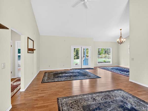 Single-story sunbelt delight, located on a 1.8+/- acre parcel close to all that the Mendocino/Fort Bragg coast has to offer. The 3-bedroom, 2.5-bath home features a desirable layout with the primary suite and additional bedrooms on opposite ends of the home. The spacious open floorplan is ideal for entertaining with vaulted ceilings, French doors leading from the livingroom and dining areas out to the covered west-facing porch down to a patio area, great for BB-Q's and gatherings around the firepit. The kitchen has solid wood, cherry cabinets, a pantry, and a propane range. The primary suite is extra spacious with an attached office area, double walk-in closets, and a sleeping area (TV's included) with a bathroom with double sinks, a soaking tub, and a walk-in shower. There is plenty of storage in the 936+/- sq.ft. 3-car garage with workshop and floor-to-ceiling cabinets. The paved driveway leads to the small orchard, RV hook-up area and access to the large yard surrounded by mature trees.