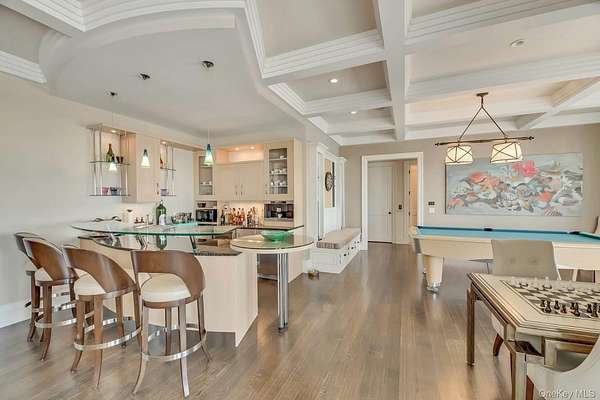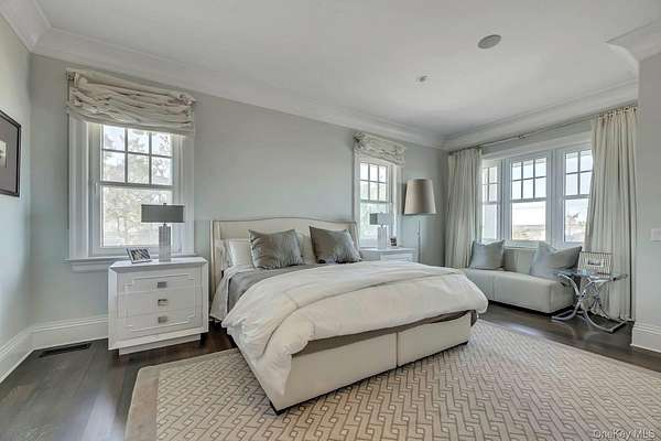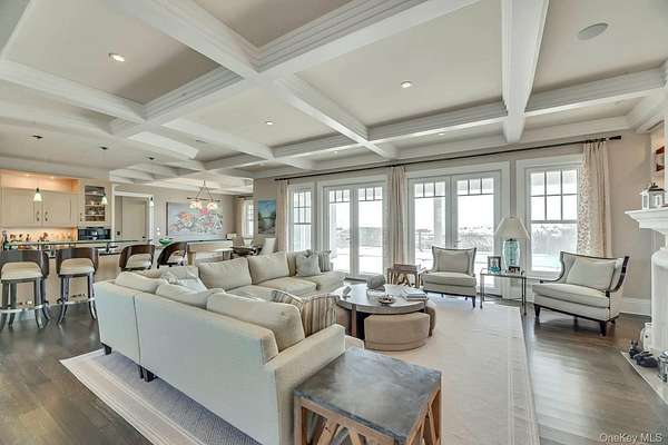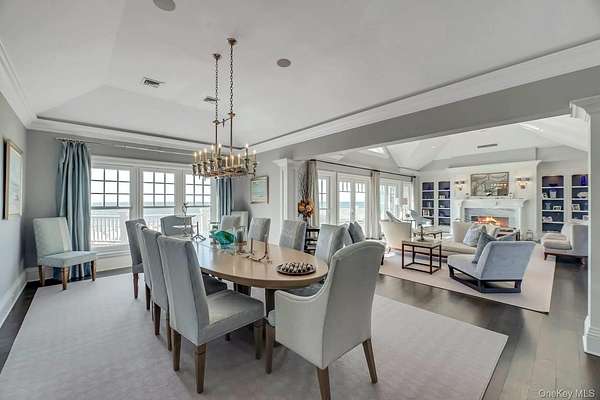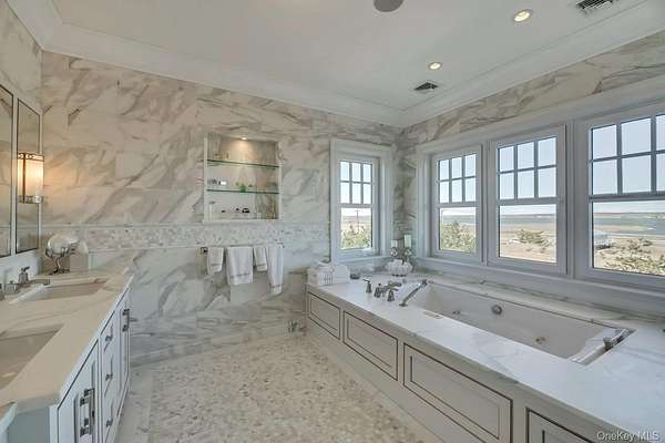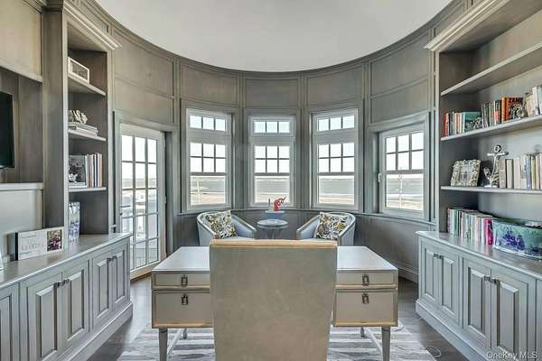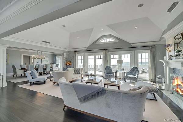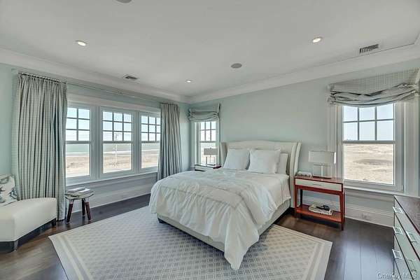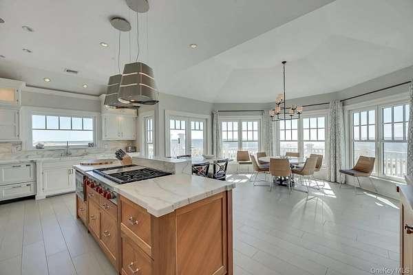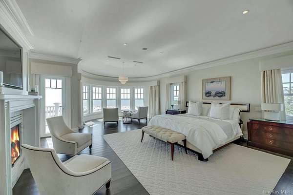 Outstanding state-of-the-art professionally decorated 7300SF oceanfront home. Each of the 7 en-suite bedrooms have panoramic ocean and bay views. The home has a grand entry foyer with a majestic sweeping staircase and opens to a double-sized living room (one of 2 living rooms) with a fireplace, wet bar, and side poolroom. French doors lead to an extra large oceanfront heated Gunite pool with a jacuzzi and is surrounded by ample decking and designer outdoor furniture. The level also has 3 en-suite bedrooms, an elevator, a back staircase, and stairs into the 2 car garage. The 2nd floor has an enormous Master suite with floor-to-ceiling windows showcasing an expansive ocean view. There are stunning built-ins and a wet bar. The stunning bath offers magnificent bay views, a large soaking tub, a large shower, and double sinks. and bidet all with top-line fixtures. Additionally on this floor are the additional bedrooms, the 2nd beautifully designed and professionally decorated living room with a fireplace. and balcony to step out onto and see the panoramic view of miles of an unpopulated Oceanfront and additionally the most amazing sunsets over the bay. The adjoining large dining room also has sweeping views of the ocean. It leads into the gourmet, designer, eat-in kitchen with superior top-line appliances offering all the" bells and whistles". The breakfast nook has semicircle floor-to-ceiling windows with mile long views of the ocean waves breaking on the wide beach. This floor has a wood-paneled office with built-ins and also a semicircle wall of windows with remarkable unobstructed bay vistas. An ample elevator travels to all floors. The 2 acre property has 180' of premiere ocean frontage and beautiful open bayscapes. There is a 3rd floor "widow's walk" with the most breathtaking bay and ocean vistas. Add to this a very private setting and you have an exceptional and rare summer rental. *also available July 15th to Sept 7th, 2026 for $350,000