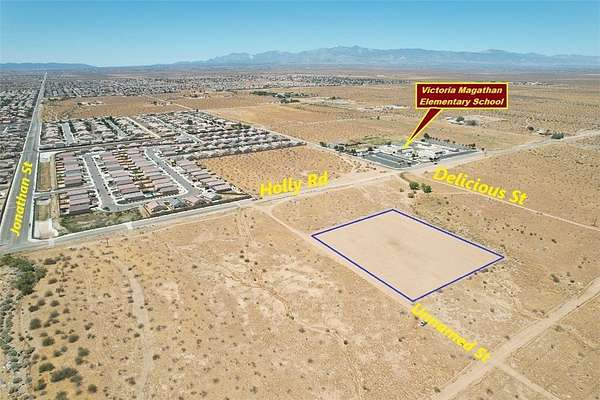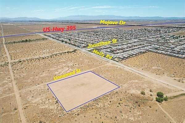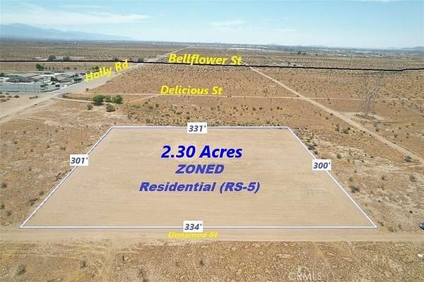 Great location and Investment Opportunity! Nice clean and flat 2.30 Acres of land, per City of Adelanto, CA, the property is zoned Single Family Residential (R-S5), According to the zone district is a single-family zone which permits detached residences at a density of up to five (5) units per gross acre, Electricity, Water and Sewer are on Holly Rd, approx 300 Ft south of the property, the lot has a street easement (Unnamed St) for access. Approximately 3500 ft, or 0.66 Mile West of Hwy 395., Dotted lines on the pictures are just estimated, and not the exact property lines, buyer to do their due diligence regarding property line, and utilities for more accurate distances and costs, GOOGLE MAP CORDINATES ARE: 34.544417, -117.411028, make your offer today.