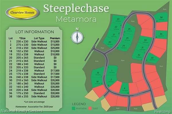 Award Winning Clearview Homes is building in Steeplechase a spectacular luxury residential community in the beautiful countryside of Metamora Township! Providing a Setting of sophisticated country elegance for the construction of your dream home just 22 miles north of Auburn Hills. Steeplechase is located in the legendary Metamora Hunt area and 1 mile south of the Village of Metamora and its Historic White Horse Inn. 1 acre home sites are available with an extraordinary 295-acre environment of hills and valleys filled with mature hardwood and evergreen trees, deer, fox, wild turkey and pheasant. All home sites are adjacent to wooded open spaces. Several homesites offer walk out lower levels! This listing is for our Popular model the Rockford with an additional first-floor bedroom and a covered patio! This well thought out home has all the space exactly where you want it:) 5 Bedrooms all with walk in closets. The primary Suite is entered through French Doors and is on the opposite side from the other bedrooms for added privacy. Plus, the Laundry Room is upstairs! The first floor offers open concept living from the Kitchen to Great Room with a Dining Room, and Two Flex Rooms:) Ideal for Home Offices, Kids' Playroom etc. The Rockford has a spacious mudroom and excellent walk-in pantry. The covered patio will be perfect to relaxing after a long day at work! The 8'6" Basement will be partially finished: Its drywalled, tapped, mudded and primed and includes the 3-piece prep for a future bathroom! This high efficiency home has It all. Buy new for all the latest building techniques and warranties! Wait until you see our Included features:) Please drive though the community and see how breath taking it is:) all photos from Rockford Model in Independence Township:) this listing is for lot 19. Other lots available:)