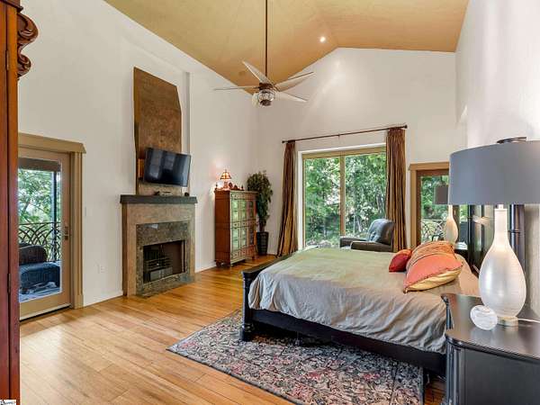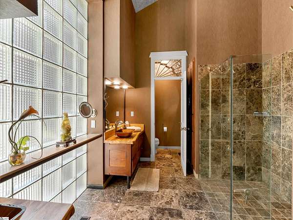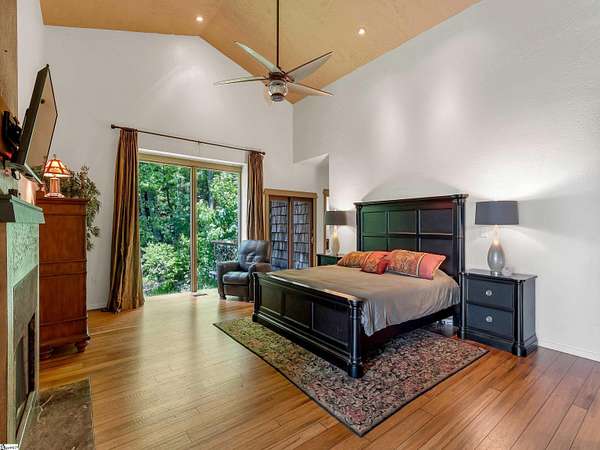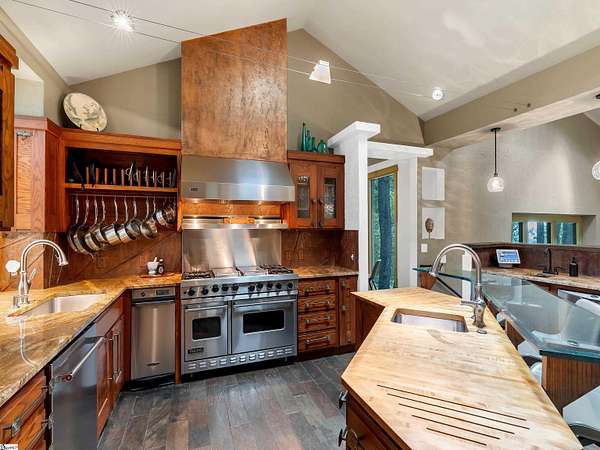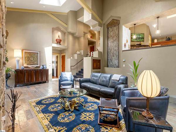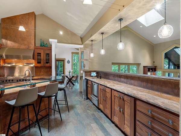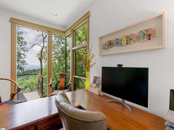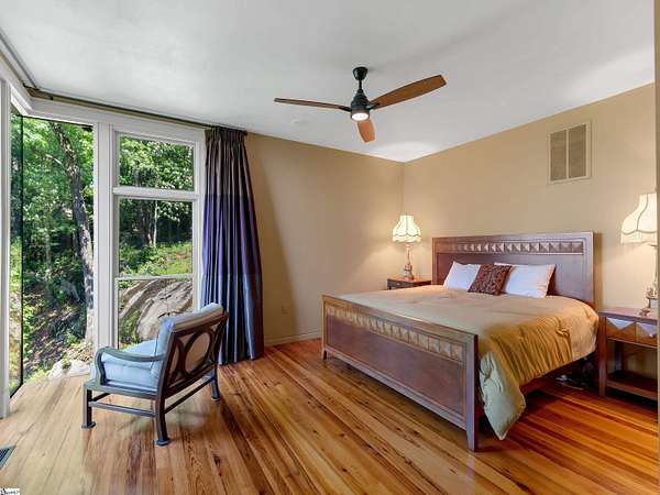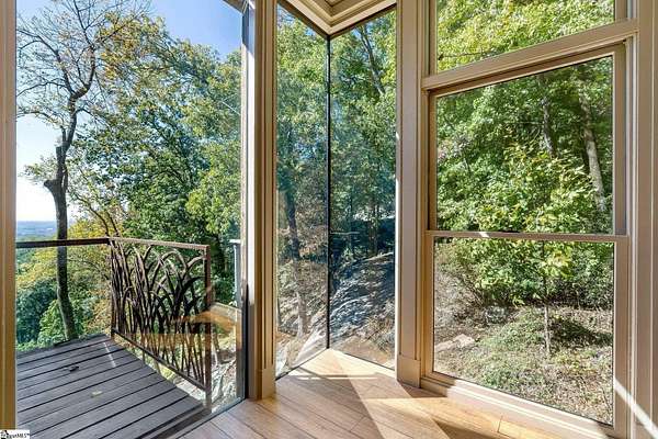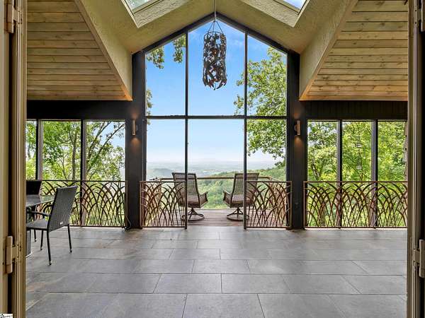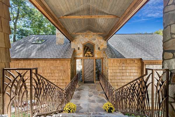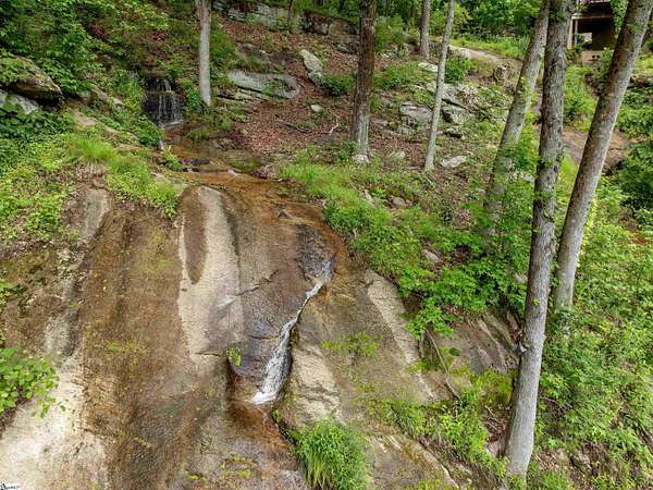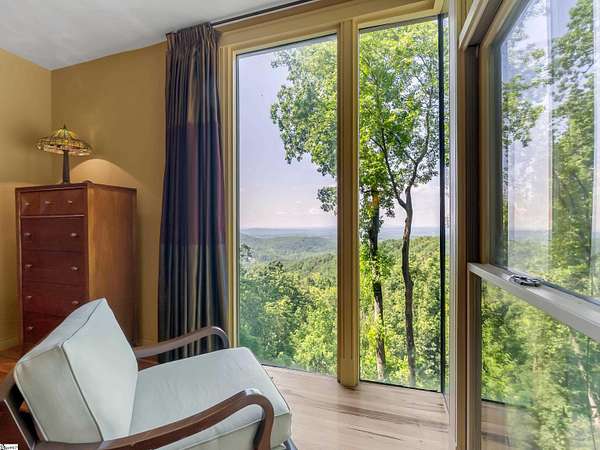 Nestled within The Cliffs at Glassy, this extraordinary estate spans over five acres, seamlessly blending refined architecture with the natural beauty of its surroundings. Thoughtfully designed to embrace the landscape--including a striking natural waterfall--this one-of-a-kind home is a sanctuary of artistry & elegance. A sense of wonder greets you upon arrival. A custom bridge, adorned with metalwork by acclaimed artist-blacksmith John Boyd Smith, spans a water feature, guiding you to the entrance. There a handcrafted copper door--framed by locally made stained-glass transoms--invites you in where craftsmanship, design, & nature exist in perfect harmony. Step into this Frank Lloyd Wright-inspired masterpiece & discover a symphony of design & natural light that highlights the home's organic elegance. The entryway opens to a breathtaking, panoramic view of Paris Mountain. At the heart of the home, the great room features a stone gas fireplace, an indoor 9' recirculating water wall & sealed slate floors. Just beyond, a spacious deck, with custom-forged metal railings, invites seamless indoor-outdoor living. A handcrafted light fixture, artfully designed to reflect the leaf of every type of tree found on the property, serves as a natural conversation piece. Whether gathered around the wood-burning fireplace or gazing off one of the four balconies, you'll find endless opportunities to unwind & take in the serene beauty of Glassy Mountain. At the heart of the home, the custom-designed gourmet kitchen caters to culinary enthusiasts with high-end appliances, including a Viking range with double ovens, Sub-Zero refrigerator, two dishwashers, a warming drawer, a wine chiller, an ice machine, & three sinks. A butcher block countertop with built-in bread-cutting station adding both function & charm, compliments the surrounding granite countertops. Blending rustic character with contemporary style, a raised beveled glass bar & a copper-finished serving counter introduce artistic flair. An updated walk-in butler's pantry--with additional cabinetry & a full size freezer--provides ample storage space. Adding to the charm of this exceptional kitchen is one of the home's four gas fireplaces. Just off the kitchen, the cozy breakfast room offers a built-in Bosch coffee station & sweeping views of mountains, making every morning a serene experience. The primary bedroom features a cathedral ceiling, gas fireplace, & bamboo-striated floors. It seamlessly connects to the keeping room with a private balcony, currently used as a home office, framing the landscape of Paris Mountain & the natural waterfall. A walk-in closet with stacked washer/dryer leads to a private workspace above via a spiral staircase. The primary bath is a spa-like sanctuary with Kohler glass vessel sinks, soaking tub, & makeup vanity. The lower level features two spacious en-suite bedrooms, one with views of the waterfall. Bathrooms include frameless glass showers, heated tile floors, a sauna, & a private water closet. A theater/recreation room with cedar ceilings & skylights offers the perfect space for entertaining, alongside a fully equipped wet bar & a wine cellar with cork flooring, dual chillers, & room for 250 bottles. The theater includes a 110-inch screen, built-in bookcases, & custom media cabinets. Above the garage, a secluded guest suite offers versatile space--perfect for visitors, recreation, or hobbies. Thoughtful upgrades include new lighting along the driveway and east side path along the house, multiple redesigned storage spaces, high-end appliances, new lighting & ceiling fans, fresh paint, & smart switches & thermostats integrated with Alexa for voice control. This estate is a rare blend of natural beauty & artistic vision--a sanctuary that inspires creativity, nurtures tranquility, & celebrates the art of living in harmony with the world around you. A Club membership at The Cliffs is available with this property giving you access to all seven communities.