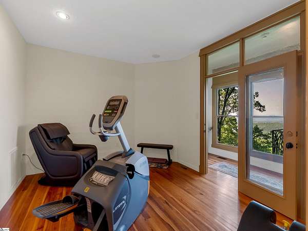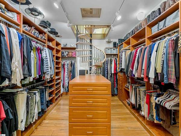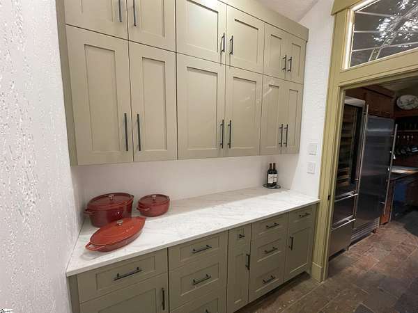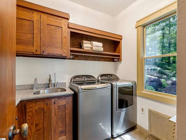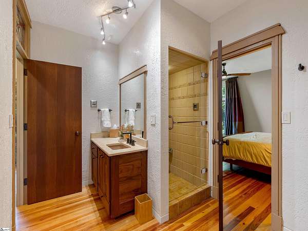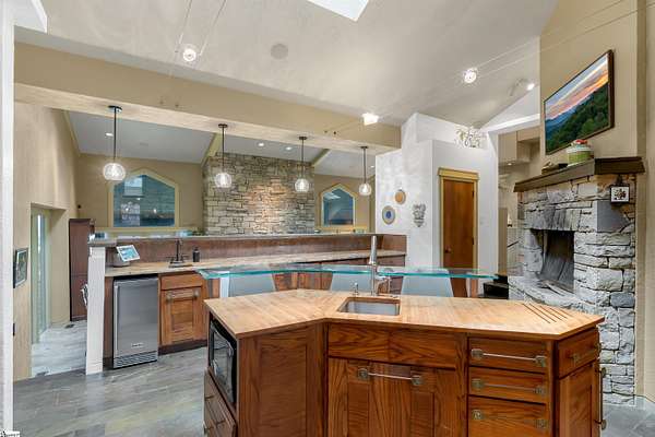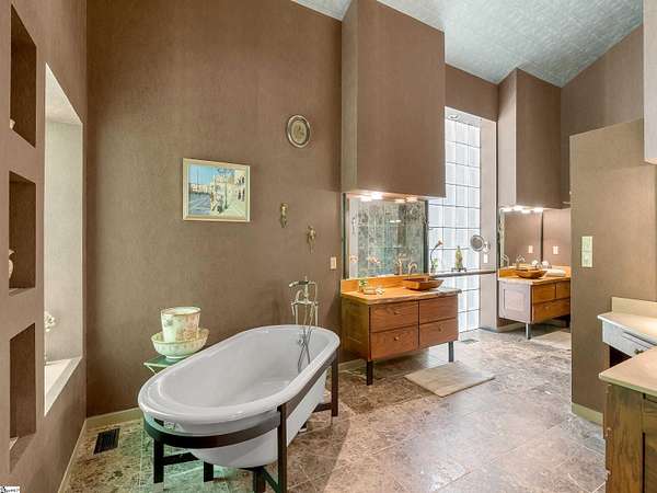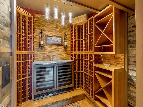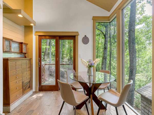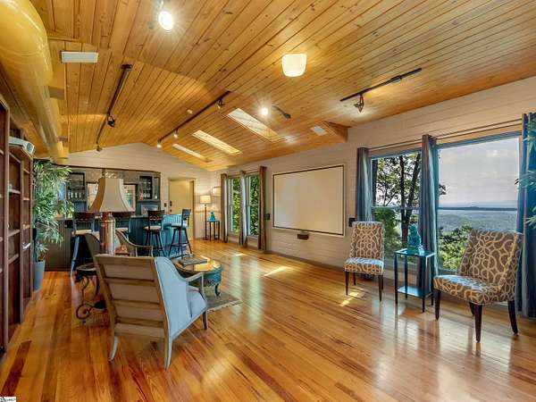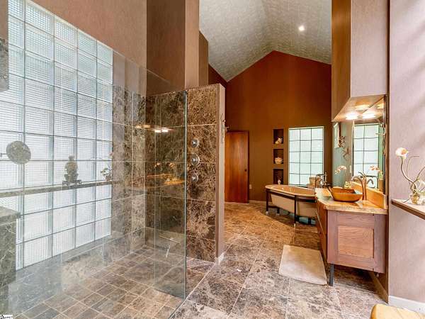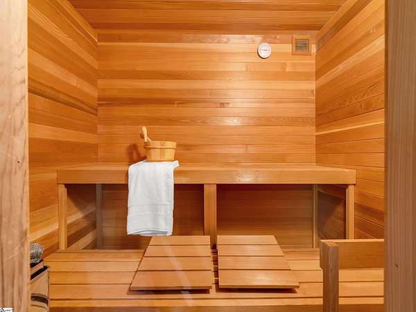 Nestled within The Cliffs at Glassy, this extraordinary estate spans over five acres, seamlessly blending refined architecture with the natural beauty of its surroundings. Thoughtfully designed to embrace the landscape--including a striking natural waterfall--this one-of-a-kind home is a sanctuary of artistry & elegance. A sense of wonder greets you upon arrival. A custom bridge, adorned with metalwork by acclaimed artist-blacksmith John Boyd Smith, spans a water feature, guiding you to the entrance. There a handcrafted copper door--framed by locally made stained-glass transoms--invites you in where craftsmanship, design, & nature exist in perfect harmony. Step into this Frank Lloyd Wright-inspired masterpiece & discover a symphony of design & natural light that highlights the home's organic elegance. The entryway opens to a breathtaking, panoramic view of Paris Mountain. At the heart of the home, the great room features a stone gas fireplace, an indoor 9' recirculating water wall & sealed slate floors. Just beyond, a spacious deck, with custom-forged metal railings, invites seamless indoor-outdoor living. A handcrafted light fixture, artfully designed to reflect the leaf of every type of tree found on the property, serves as a natural conversation piece. Whether gathered around the wood-burning fireplace or gazing off one of the four balconies, you'll find endless opportunities to unwind & take in the serene beauty of Glassy Mountain. At the heart of the home, the custom-designed gourmet kitchen caters to culinary enthusiasts with high-end appliances, including a Viking range with double ovens, Sub-Zero refrigerator, two dishwashers, a warming drawer, a wine chiller, an ice machine, & three sinks. A butcher block countertop with built-in bread-cutting station adding both function & charm, compliments the surrounding granite countertops. Blending rustic character with contemporary style, a raised beveled glass bar & a copper-finished serving counter introduce artistic flair. An updated walk-in butler's pantry--with additional cabinetry & a full size freezer--provides ample storage space. Adding to the charm of this exceptional kitchen is one of the home's four gas fireplaces. Just off the kitchen, the cozy breakfast room offers a built-in Bosch coffee station & sweeping views of mountains, making every morning a serene experience. The primary bedroom features a cathedral ceiling, gas fireplace, & bamboo-striated floors. It seamlessly connects to the keeping room with a private balcony, currently used as a home office, framing the landscape of Paris Mountain & the natural waterfall. A walk-in closet with stacked washer/dryer leads to a private workspace above via a spiral staircase. The primary bath is a spa-like sanctuary with Kohler glass vessel sinks, soaking tub, & makeup vanity. The lower level features two spacious en-suite bedrooms, one with views of the waterfall. Bathrooms include frameless glass showers, heated tile floors, a sauna, & a private water closet. A theater/recreation room with cedar ceilings & skylights offers the perfect space for entertaining, alongside a fully equipped wet bar & a wine cellar with cork flooring, dual chillers, & room for 250 bottles. The theater includes a 110-inch screen, built-in bookcases, & custom media cabinets. Above the garage, a secluded guest suite offers versatile space--perfect for visitors, recreation, or hobbies. Thoughtful upgrades include new lighting along the driveway and east side path along the house, multiple redesigned storage spaces, high-end appliances, new lighting & ceiling fans, fresh paint, & smart switches & thermostats integrated with Alexa for voice control. This estate is a rare blend of natural beauty & artistic vision--a sanctuary that inspires creativity, nurtures tranquility, & celebrates the art of living in harmony with the world around you. A Club membership at The Cliffs is available with this property giving you access to all seven communities.