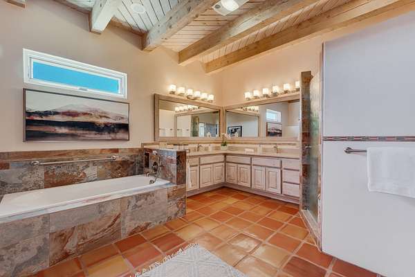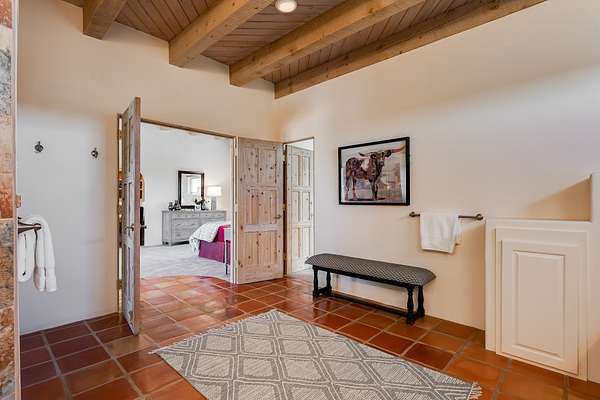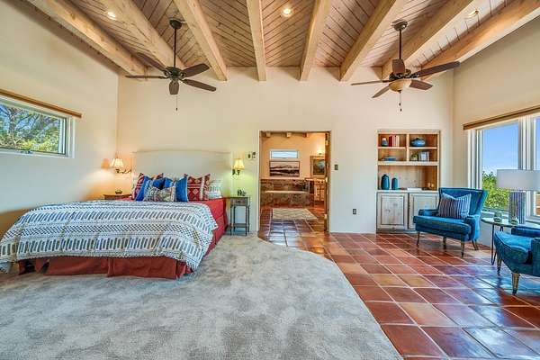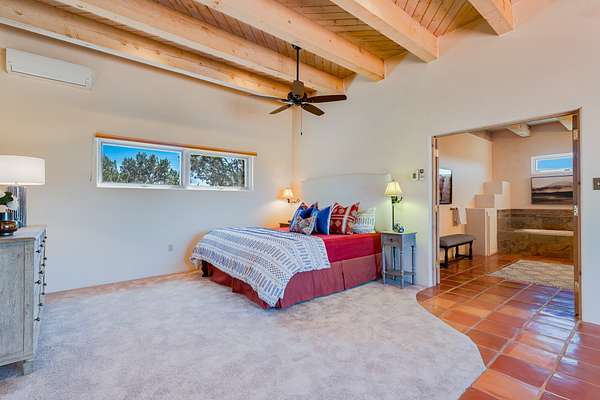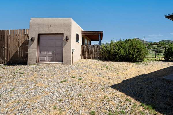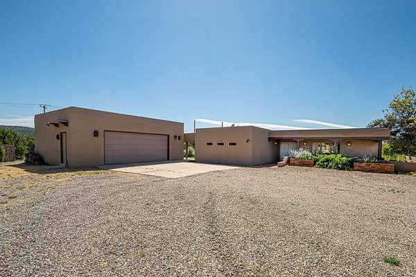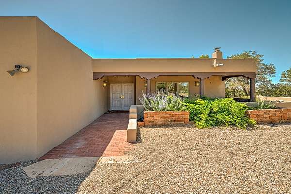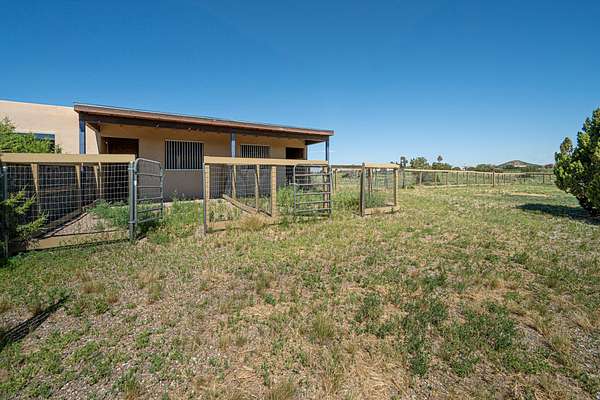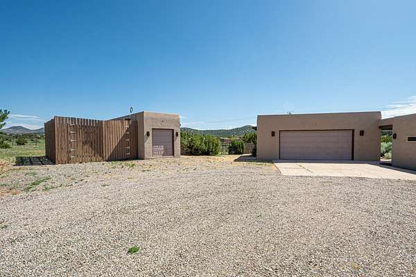 Southwestern charm meets modern comfort and functionality with this home with 3 peaceful acres with tranquil views of both sunrise and sunsets. This lovely property offers the best of rural living just minutes from the amenities of town. The home's open living area is warm and inviting, featuring Saltillo tile floors, high ceilings, and a traditional kiva fireplace-the perfect space to relax or entertain. The large master suite is a private sanctuary with its own sitting area and a second kiva fireplace, offering the kind of comfort and space that's rare to find. A separate bonus room with its own bath adds incredible flexibility-ideal as a guest suite, private office, or artist's studio. Additional features include community water, radiant in-floor heating, natural gas, and mini-split units for cooling, ensuring comfort year-round. Located in the Eldorado school system, this home offers a rare blend of privacy, convenience, and natural beauty. Home has been pre-inspected. If you have horses to bring, this property delivers with a two-stall barn, a half-acre turnout, and direct access to an easement which can be used for riding. Whether you want to saddle up or just take a peaceful hike, you can head out your back door.