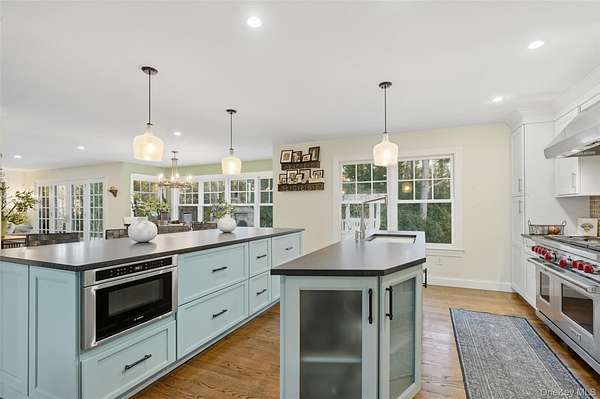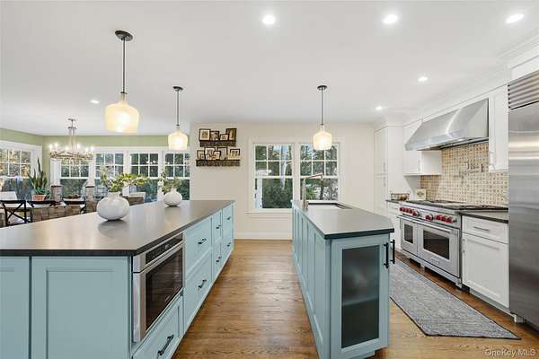 Serene Country Sophistication...Tucked along a quiet country cul-de-sac, this striking 4,060 SF home blends timeless craftsmanship with modern luxury. The two-toned cedar exterior sets the tone for refined country living. Inside, an inviting open-concept layout centers around a floor-to-ceiling stone fireplace, showcasing rich millwork, solid wood doors, wide-board oak floors, and elegant French doors. Remodeled in 2020, the chef's kitchen is a true showpiece; granite counters, Wolf range, and Sub-Zero refrigerator with two islands flowing seamlessly into the dining area, living room, and family room. Step through French doors to an expansive Trex deck and stone patio featuring a magnificent stone fireplace and outdoor pizza oven-an entertainer's dream. Thoughtful landscape lighting casts a soft evening glow, creating a magical ambiance for al fresco dining, festive gatherings under the stars, or quiet moments surrounded by lush, private grounds and a fully fenced yard. This outdoor oasis is completed by a heated Gunite pool (installed in 2018), framed by professional landscaping and accent lighting for year-round beauty. The first-floor primary suite is a private retreat with two walk-in closets and a spa-inspired bath featuring a claw-foot tub and oversized walk-in shower. Upstairs, discover two spacious bedroom en-suites with large closets and beautifully appointed baths, along with a third private en-suite bedroom accessed from the back staircase-ideal for guests or extended family. The three-car garage connects to a mudroom and laundry area, combining convenience with thoughtful design. Additional highlights include a security system, automatic Generac generator, brand-new hot water heater, and a boiler less than 10 years old. A home of exceptional comfort and craftsmanship; where every detail reflects quality, warmth, and understated elegance.