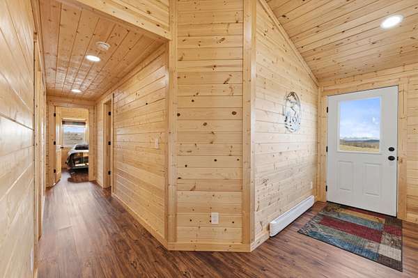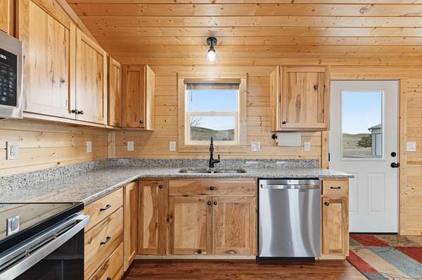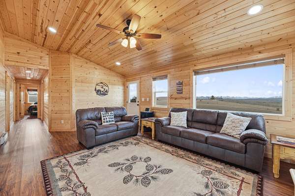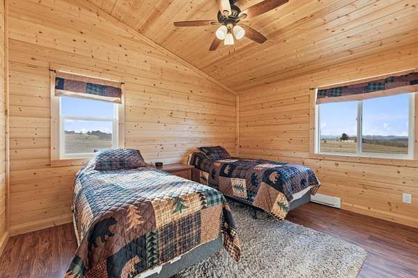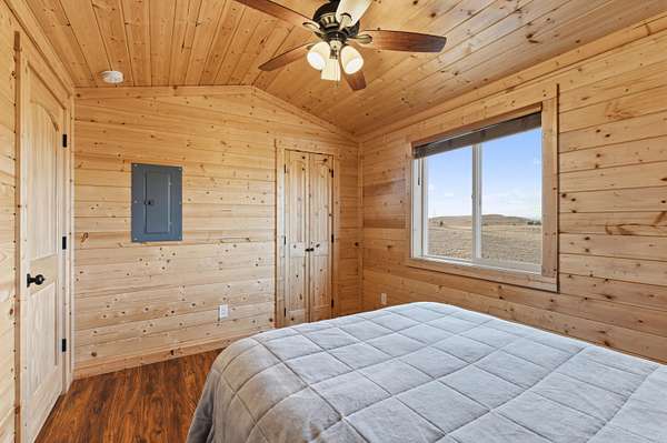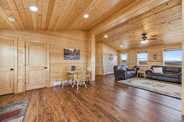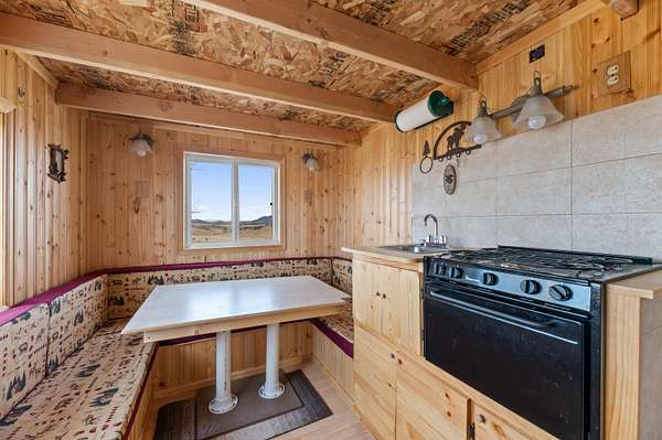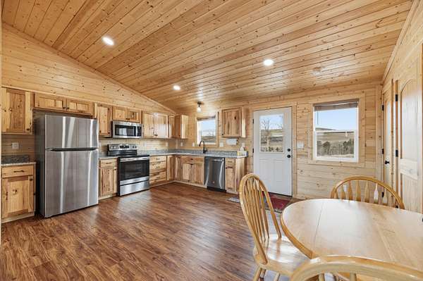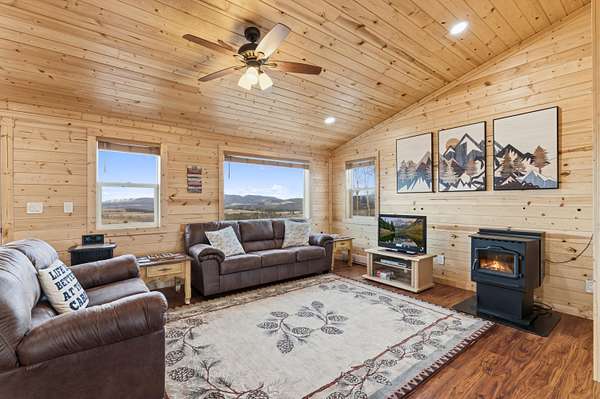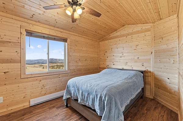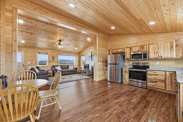 The 1,352 square foot mountain style cabin was built in 2021 and has been immaculately maintained. The home features three bedrooms and 1.75 bathrooms, all electric utilities, and quality finishes throughout. Large windows are positioned to capture views in every direction, bringing natural light into the main living spaces and framing the surrounding landscape. The interior is being offered fully furnished with mountain style furniture, beds, and decor. High end appliances are included, making the home ready for immediate use. The layout is efficient and functional, suitable for year round living or seasonal enjoyment. The area immediately surrounding the home is fenced, providing separation for seldom-grazing livestock that keep property taxes under $200/year.
