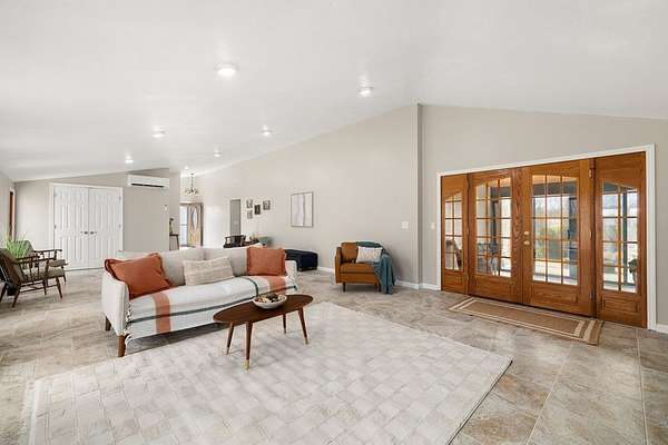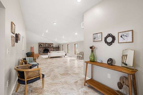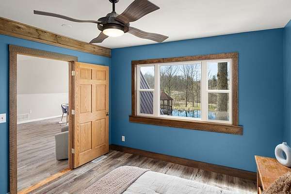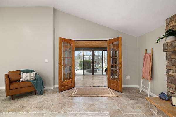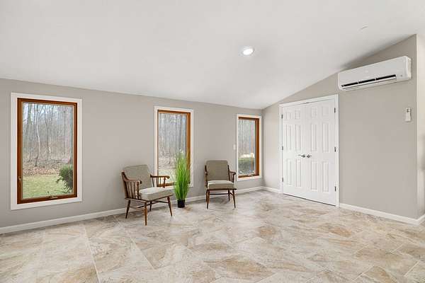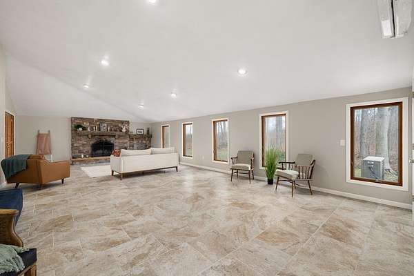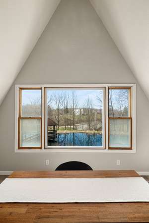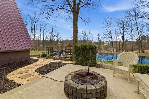 Welcome to this uniquely modern A-frame home, tucked away on 3.7 acres of partially wooded land. Surrounded by nature and filled with modern charm, this property offers a cozy escape where every view feels like a breath of fresh air. Step inside to soaring cathedral ceilings and a welcoming living room centered around a large stone fireplace—the perfect spot to gather on chilly evenings. With 3 bedrooms and 2 full baths, there's plenty of space to relax, including a comfortable primary suite featuring its own en-suite bath with a garden tub. The kitchen is both functional and inviting, offering a 7-burner stove, plenty of cabinet space, and a pantry to keep everything neatly tucked away. Just off the living room is the sunroom where you can sit and enjoy nature. Outside, the charm continues with a tranquil pond, a gazebo, and a stone fire pit. The over sized 4+ car garage provides plenty of room for vehicles and hobbies.