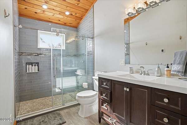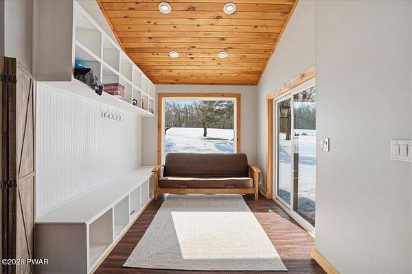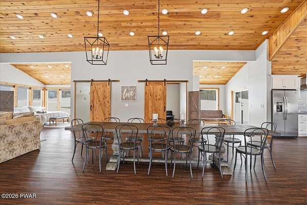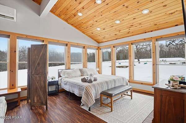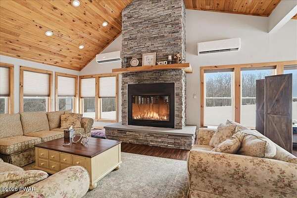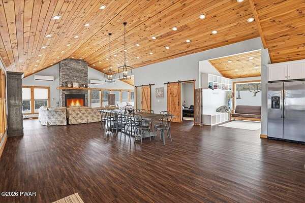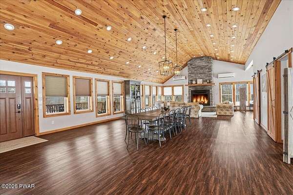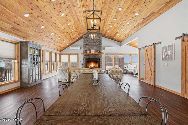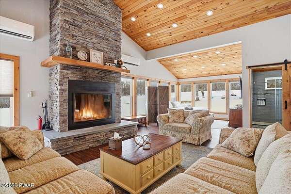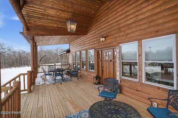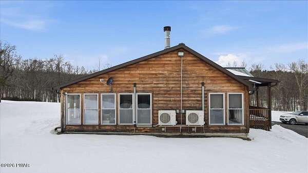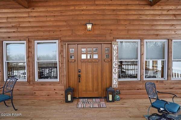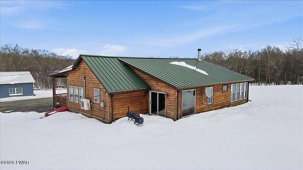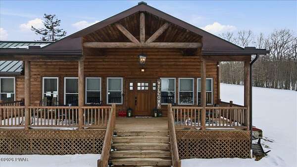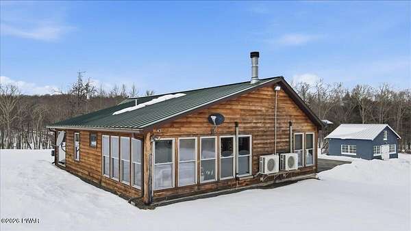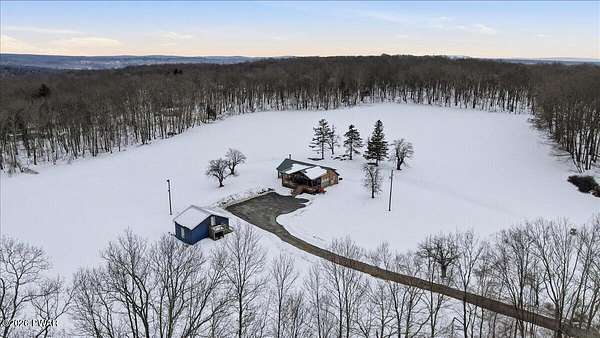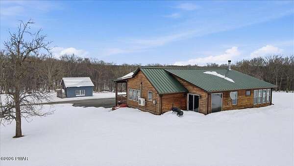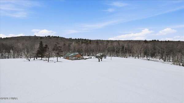 AN EXTRAORDINARY and rare offering! Presenting to the market a nearly 70-acre private retreat featuring a completely renovated, natural light-drenched cabin that perfectly blends seclusion, expansive acreage, and modern design in one of the Poconos' most sought-after locations.Set at the end of a long wooded driveway in highly desirable Hawley, this property is surrounded by beautiful woodland views in every direction. Enjoy your own apple trees just steps from the home, along with abundant cleared areas ideal for recreation, gardening, outdoor entertaining, or creating trails and open lawn space. The land offers a rare combination of privacy and usability.Inside, vaulted ceilings and walls of oversized windows fill the open-concept living space with natural light while framing the peaceful forest setting. A large wood-burning fireplace anchors the main living area, creating warmth and character year-round. A flexible layout includes a spacious open sleeping area with privacy partitioning, a separate bedroom with laundry, and additional sleeping space off the main living area perfect for guests or versatile use. Multiple dining areas, including a dining space, breakfast nook, and breakfast bar, make the home ideal for gatherings.The bathroom features radiant heated floors and a beautifully tiled walk-in shower. Outdoor living is equally inviting with a covered front porch, patio, and fire pit to relax and take in the serene surroundings.A separate outbuilding with unfinished space above provides endless possibilities that you could finish for additional living space, use for storage, or convert to a barn or garageMoments from Lake Wallenpaupack, hiking, shopping, and restaurants, and downtown Hawley and Honesdale nearby.A truly rare, move-in-ready retreat offering privacy, acreage, and lifestyle in the heart of the Poconos.Use as a getaway, expand for full time living or utilize as an income producing property.NO DRIVE BY'S! CAMERAS ON PREMISES