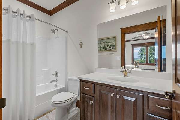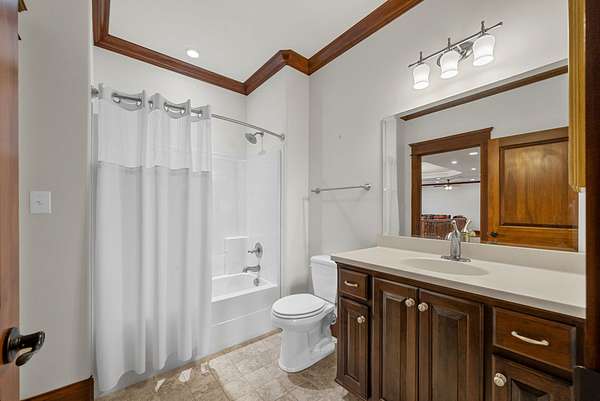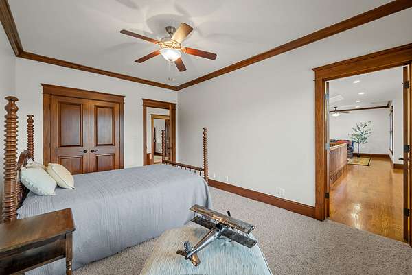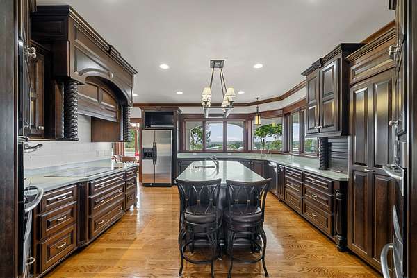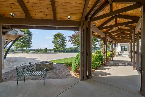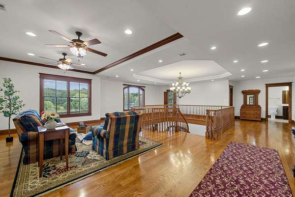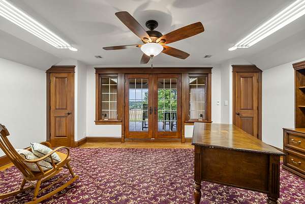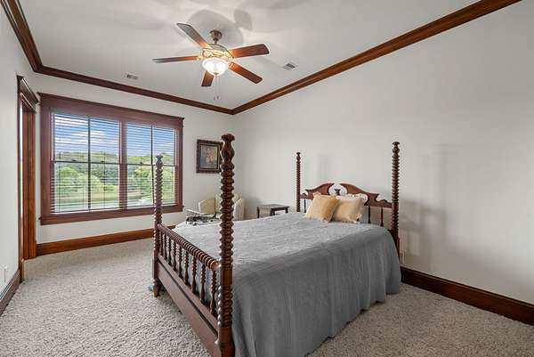 The main home offers four bedrooms, 3.5 baths, and expansive living spaces designed for both elegance and ease. The living room captures a perfect view of the 4-acre stocked lake, while the gourmet kitchen with quartz countertops, custom cabinetry, and pantry/safe room is centered between the formal dining room and breakfast nook. From the kitchen sink, enjoy panoramic views of the covered patio and the Cumberland River Valley below. A main-level primary suite features heated tile floors, dual closets with laundry drop, and full handicap accessibility. Upstairs, a second primary suite, two bedrooms with shared bath, private office with covered patio, and a gathering area with wet bar provide versatile living.