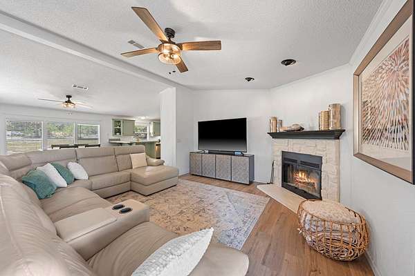 Take in stunning Hill Country views from this 4-bedroom, 3-bath home set on 3 acres in the desirable Upper Turtle Creek area. The open great room features a wood-burning fireplace and plenty of natural light, creating a welcoming space for family and friends. The kitchen offers ample cabinetry, an island, and a buffet area perfect for entertaining. The primary suite provides a private retreat with dual bathrooms, a soaking tub, and a separate shower. The home also offers excellent closet space and plenty of storage throughout. Outside, the expansive back deck is ideal for enjoying sunsets, cool breezes, or a quiet evening under the stars. The property's natural shelf rock and crushed granite add charm and make the acreage perfect for outdoor gatherings or peaceful relaxation. With incredible views, generous living space, and a prime Upper Turtle Creek location, this home combines comfort and Hill Country lifestyle in one exceptional package.