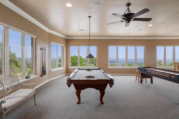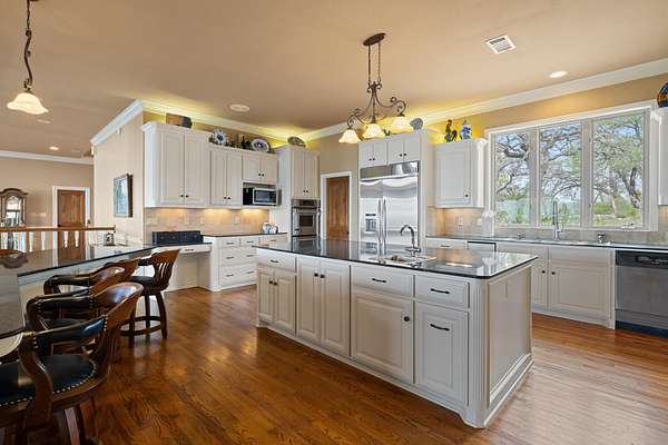 Escape to your private sanctuary nestled on the hilltop of Marble Falls, Texas, in the prestigious Cavern Ranches community. This remarkable 28.05-acre estate is fully gated and fenced, providing unrivaled privacy and panoramic views that are nothing short of breathtaking. Main House Features: Custom Stone Home: Spanning 6,326 square feet, this luxurious home includes 4 bedrooms, 4.5 bathrooms, and an elevator for ultimate convenience. Chefs Kitchen: A gourmet kitchen featuring high-end Thermador stainless steel appliances, granite countertops, an ice machine, and a spacious island perfect for entertaining. Elegant Interiors: Exquisite wood, tile, and Berber flooring, combined with upgraded fixtures throughout, create a refined atmosphere of comfort and style. Spacious Living Areas: With four expansive living spaces, including a large 4th living/game room, theres plenty of room for both relaxation and entertaining. Stone Fireplaces: Two impressive stone fireplaces add warmth and character to the homes living areas. Modern Amenities: The home includes a security system, soaring ceilings, an elevator, and a dedicated office for all your professional needs.Guest House: Detached 900 sqft: Includes a living room, kitchen, bedroom, and bathroom perfect for guests or extended family. Additional Features: Detached Workshop: A separate 3-car workshop to house tools, equipment, or personal projects.