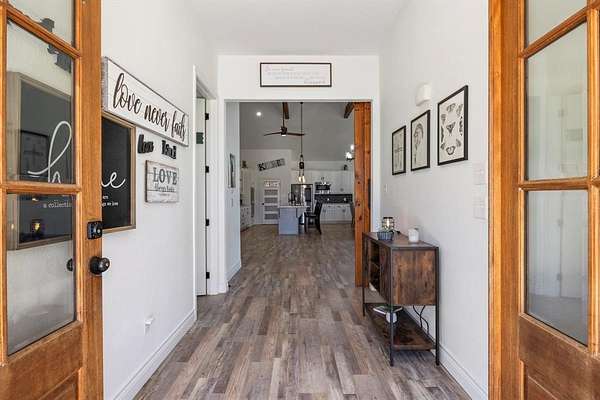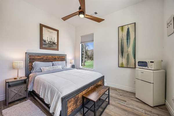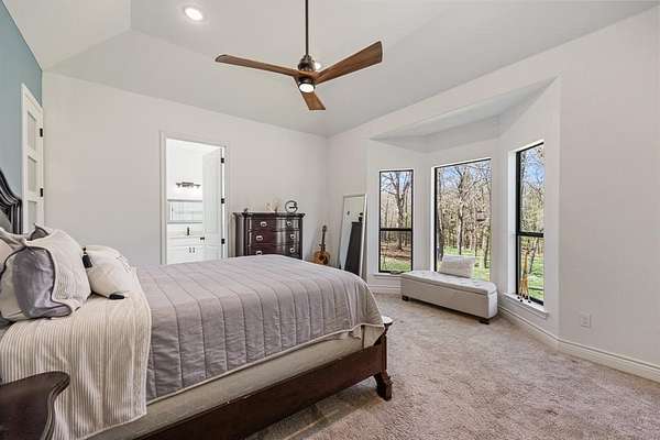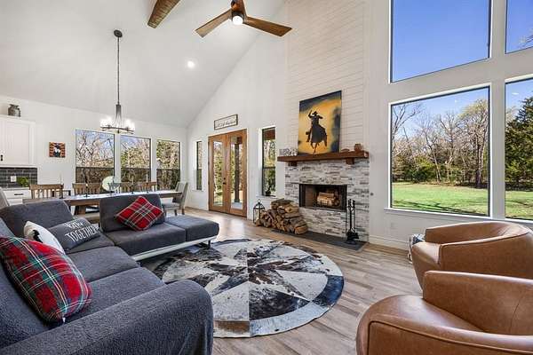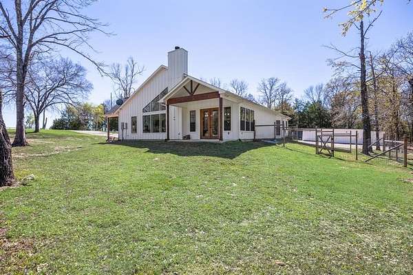 A rare East Texas retreat on 10.1 acres plus access to a private 2.7-acre lakefront lot, just minutes from Lake Tawakoni. A wide welcoming entrance leads into a bright home with cathedral ceilings, panoramic windows, and an open floor plan. The living area features a floor-to-ceiling stone fireplace, perfect for relaxing while enjoying 180-degree views of the natural surroundings. The modern kitchen flows seamlessly into the living space. The home has 3 bedrooms and 3.5 baths, including a primary suite with spa-like bath and double sinks, plus a second bedroom with exterior access and kitchenette. A private office with French doors adds a functional touch. Outdoor living shines with a full-length front porch with two swings and a side porch. The property includes 2 tiny home shell containers with metal awnings, 2 additional containers, a 40×40 storage building, large garage with workshop, and unfinished attic. Partially wooded acreage with trails and a greenbelt provides privacy, and a cell phone booster ensures connectivity. A truly one-of-a-kind property combining acreage, lake access, and endless potential.