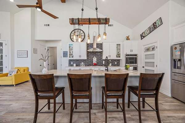 - Cathedral Ceiling(s), Central Vacuum, Chandelier, Decorative Lighting, Double Vanity, Eat-In Kitchen, Flat Screen Wiring, Granite Counters, Kitchen Island, Natural Woodwork, Open Floorplan, Pantry, Walk-In Closet(s), Wired For Data