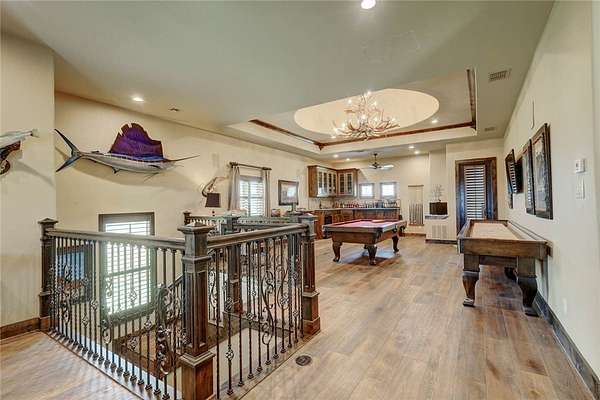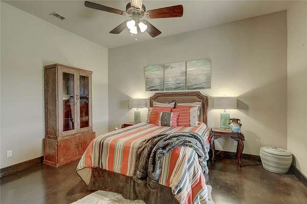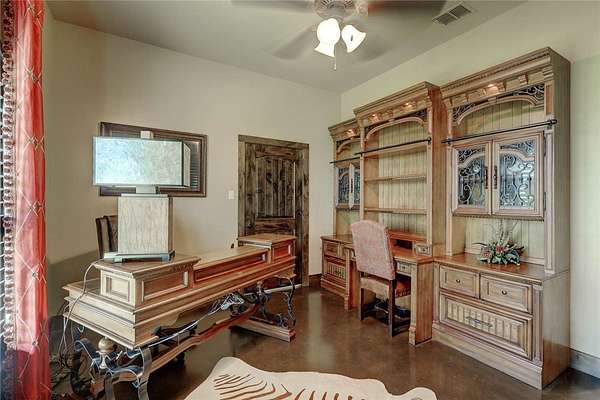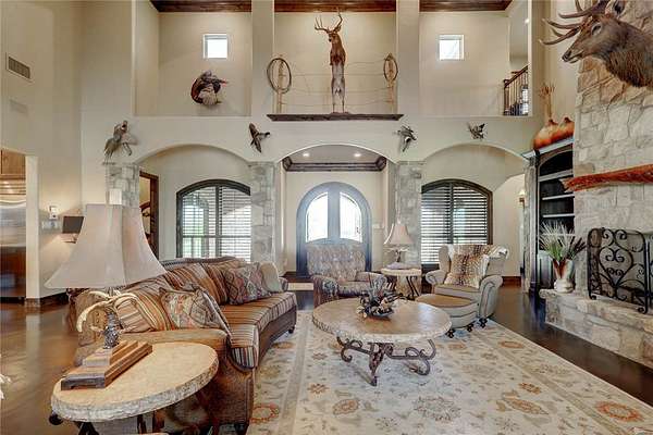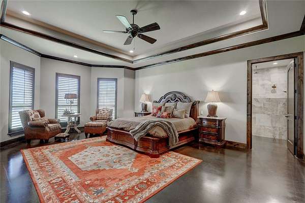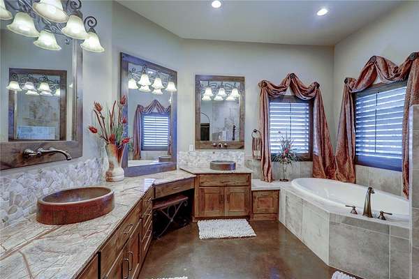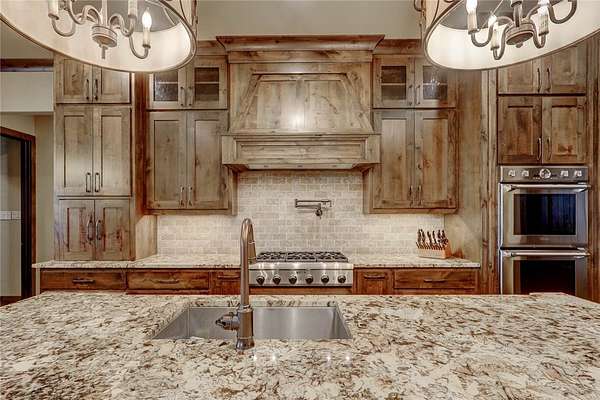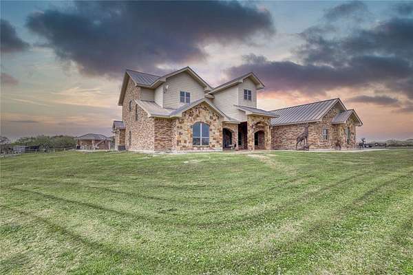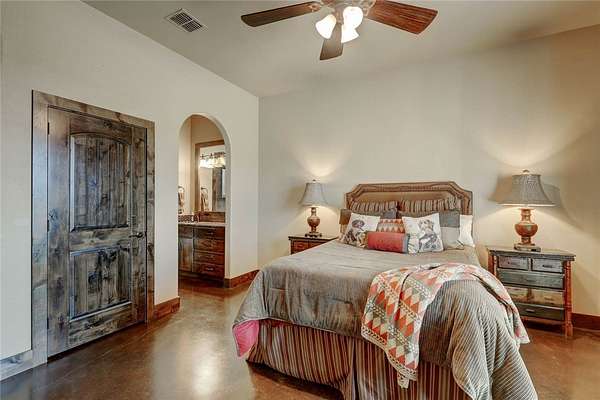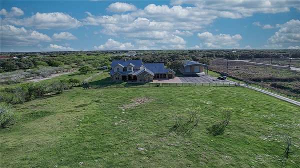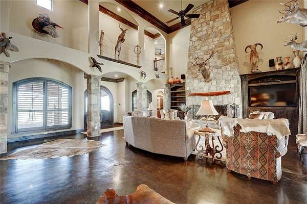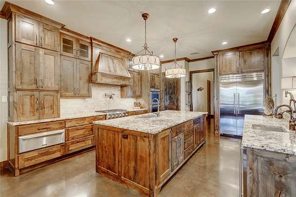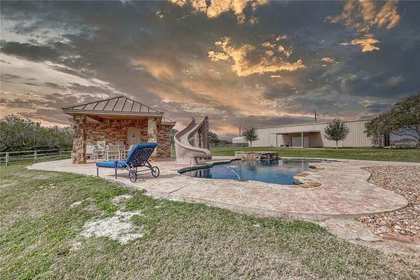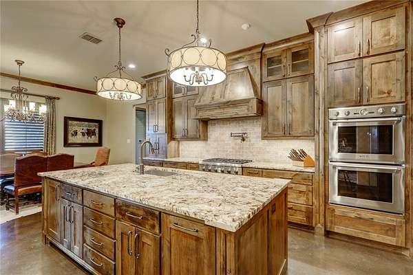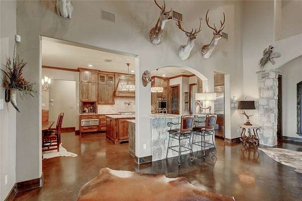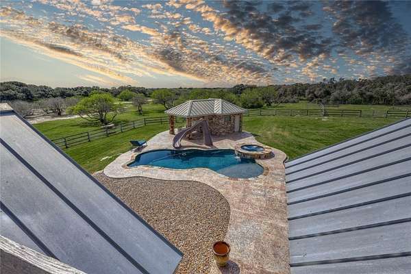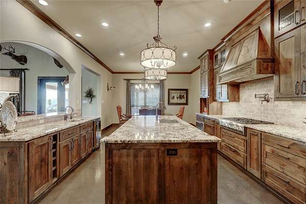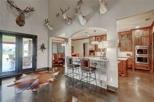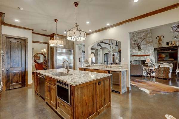 Step into a world of luxury and tranquility at 1901 Glenoak Dr, where sprawling ranch-style living meets exquisite design. This stunning 4-bedroom, 2.5-bath home encompasses 4,904 square feet of sophisticated comfort, beautifully situated on a sprawling 20-acre estate. As you enter, you are greeted by 24 ft ceilings, a wood fireplace with a mesquite mantel, and the warmth of knotty Alderwood cabinets, enhanced by stained concrete floors on the main level and rich European wood floors upstairs. The primary suite is a true retreat, featuring luxurious copper sinks, leaf vein marble counters, and an extra-large shower that promises relaxation after a long day. Culinary enthusiasts will love the gourmet kitchen, where granite countertops, a gas stove with pot filler, and top-of-the-line Thermador appliances (including two ovens and an icemaker) come together for the perfect cooking experience. An extra-large pantry with auto lights and soft-close drawers adds both style and convenience. Entertainment is a breeze in the expansive upstairs bar/game room, complete with a pool table and a stunning custom chandelier. Plus, discreet features like a secret secure room and a spacious interior gun room add an element of security and functionality. The exterior of this remarkable property is equally impressive. A 5,000 sq. ft. galvanized steel shop with an office, half bath and RV hookups with 220-volt power cater to your adventurous side. The heated pool, complemented by a slide and hot tub, alongside a UV pool system, creates a perfect outdoor oasis, which is beautifully enhanced by an outdoor kitchen and fireplace ideal for entertaining. Extras include 2 water wells, an efficient irrigation system, a stock tank pond, metal roof, 4 tankless water heaters, 2 AC units, workout room, spray foam insulation, a 500-gallon propane tank, and a full home Generac generator further elevate this luxurious offering. Don't miss your chance to claim this ranch-style oasis!