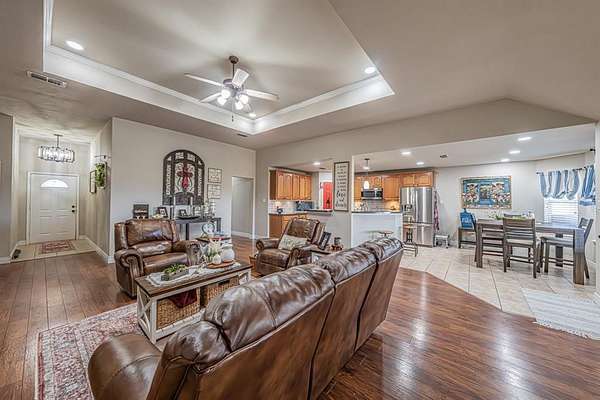 The spacious 4-bedroom, 2-bath residence features a desirable split-bedroom layout, providing privacy and comfort for family and guests. The open living spaces flow seamlessly to a large covered back patio, perfect for entertaining or simply relaxing while overlooking your land.