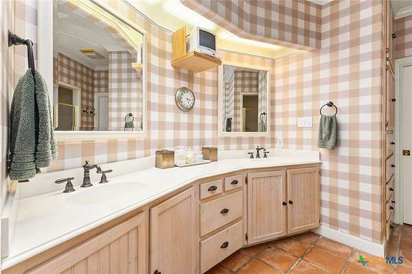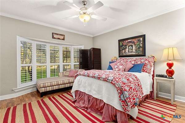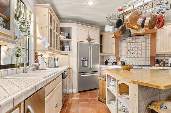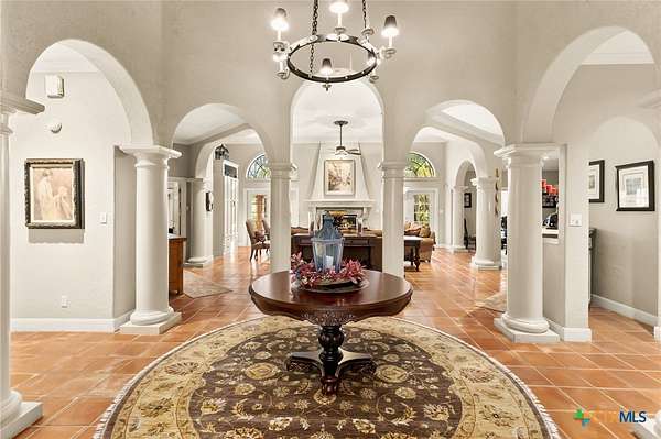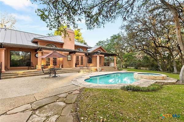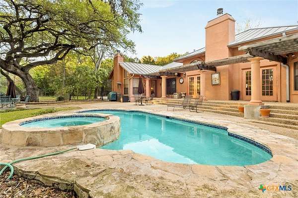 Set within the gated Riada community, this rare Guadalupe Riverfront estate offers an exceptional opportunity in one of New Braunfels' most exclusive neighborhoods. Privately positioned on over 7 acres, the property is framed by mature oak trees and thoughtfully elevated above the river, capturing both stunning natural surroundings and added privacy. The single-story home features an open-concept layout designed for effortless living and entertaining, with light-filled spaces that connect seamlessly to the outdoors. Enjoy a resort-style pool and spa overlooking the peaceful landscape, creating the perfect setting for relaxation or entertaining. With usable acreage, private river access, and a setting that feels worlds away-yet just minutes from town-this is a truly special Hill Country retreat.