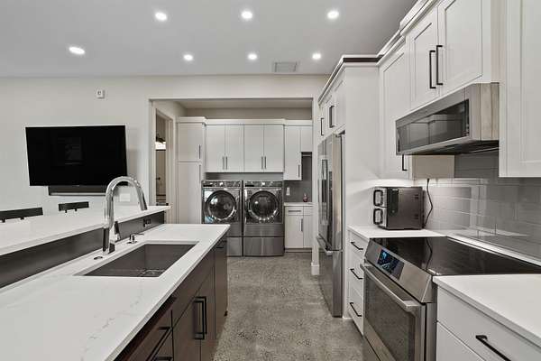 - Dishwasher, Disposal, Double Oven, Dryer, Gas Range, Hard Surface Counters, Microwave, Refrigerator, Tankless Water Heater, Washer