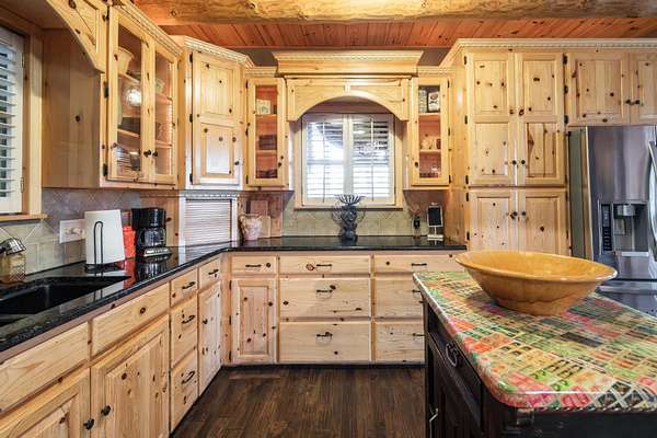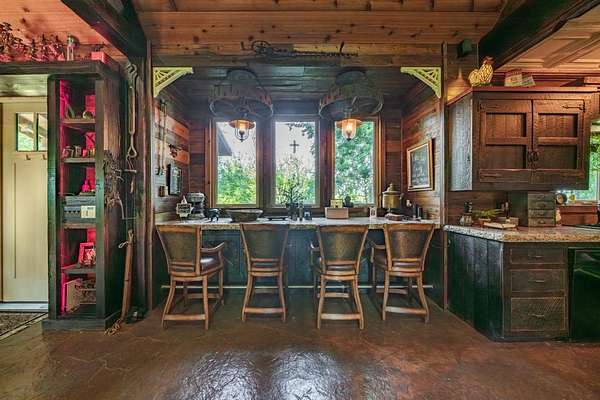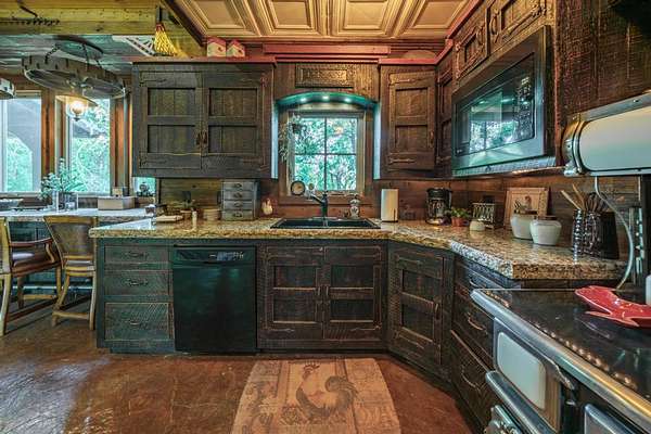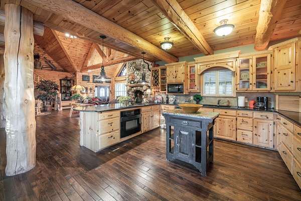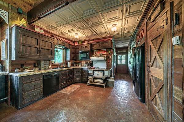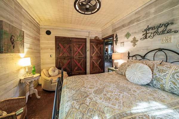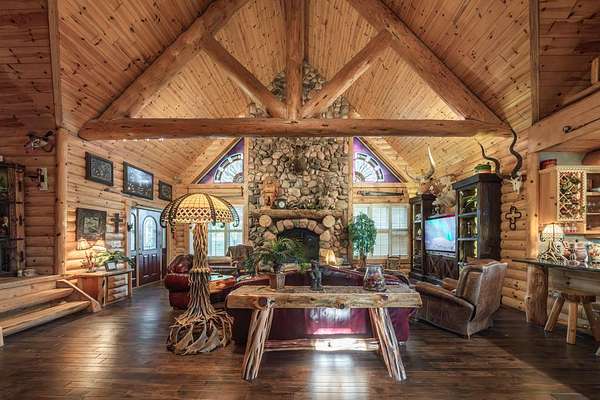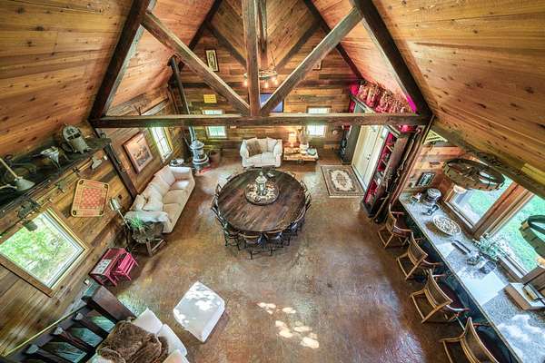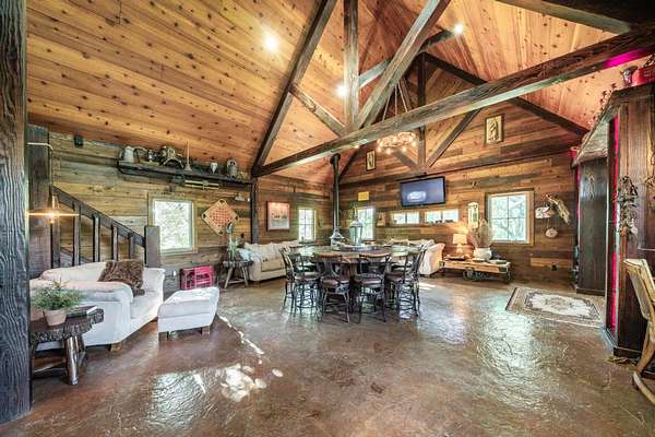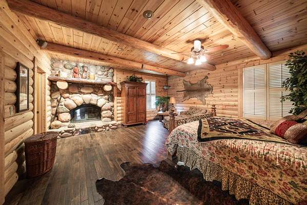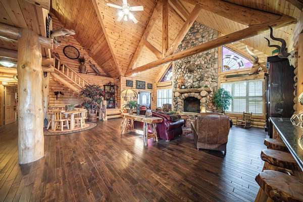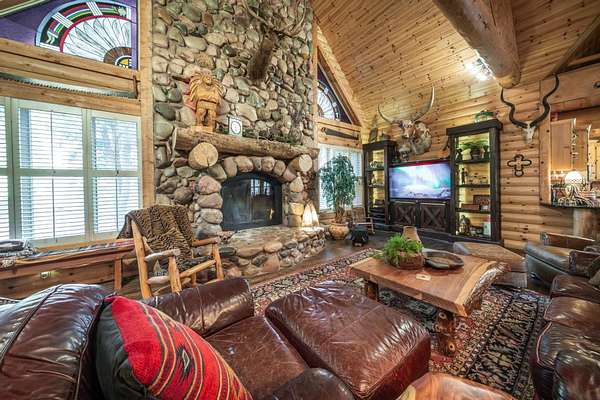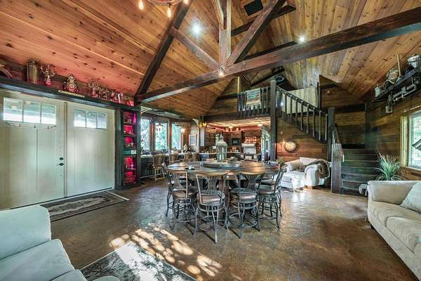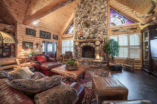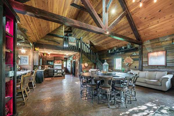 The property proudly features two distinct living quarters. The first of which is a large, real log cabin, complete with tow classically huge stone fireplaces...one in the great room and another in the master bedroom. The second building sits toward the other side of the lake and with it's eclectic finishes and decor, it is affectionately known as The Barn.