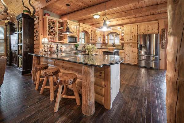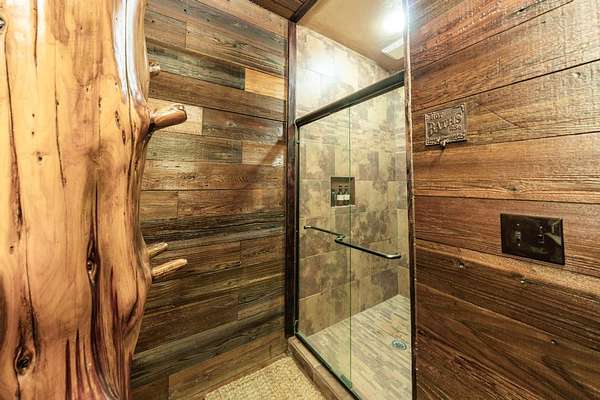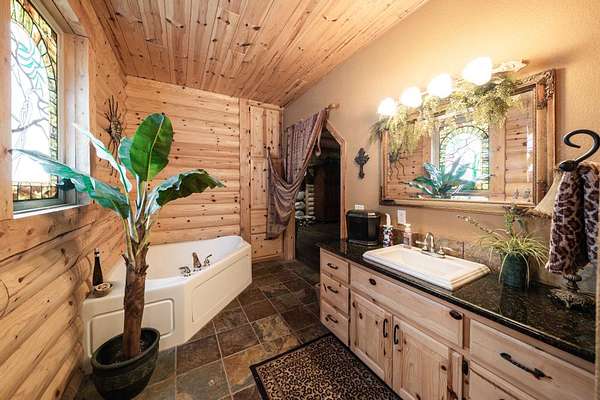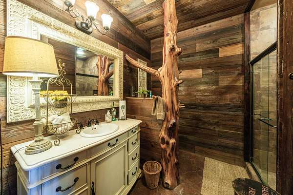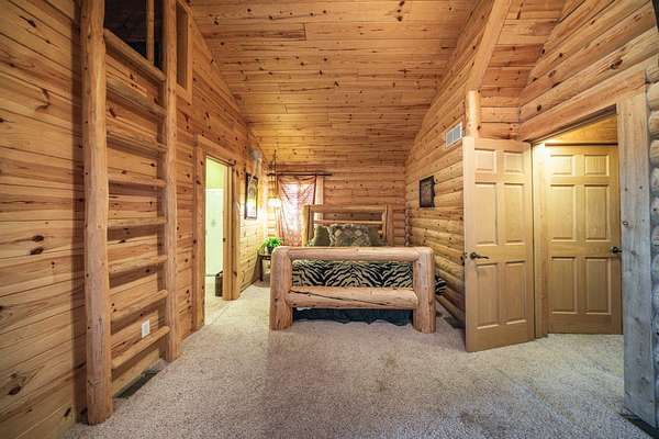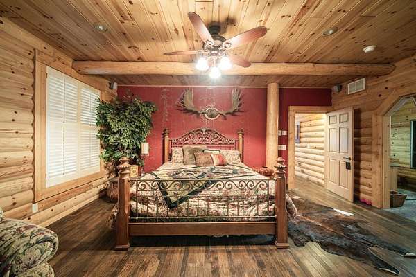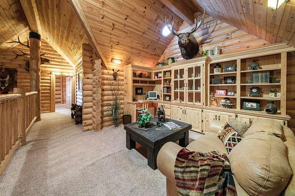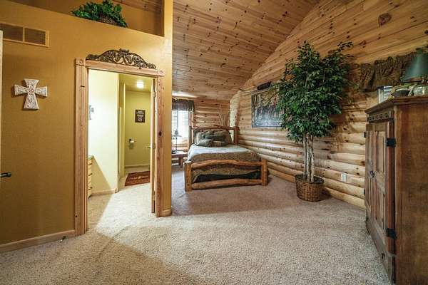 In all, this cabin has 3 bedrooms, each with their own in-suite bathroom and another half bath on the main floor. The large master bedroom again features its own river rock fireplace and huge walk-in closet. The two additional bedrooms are upstairs and on opposite sides of the home, so there is privacy abound. There is also a loft area overlooking the great room that has a day bed and has been used as to sleep additional guests.