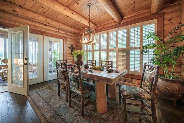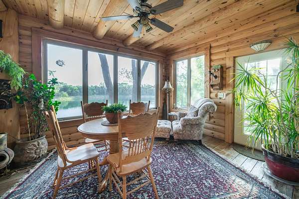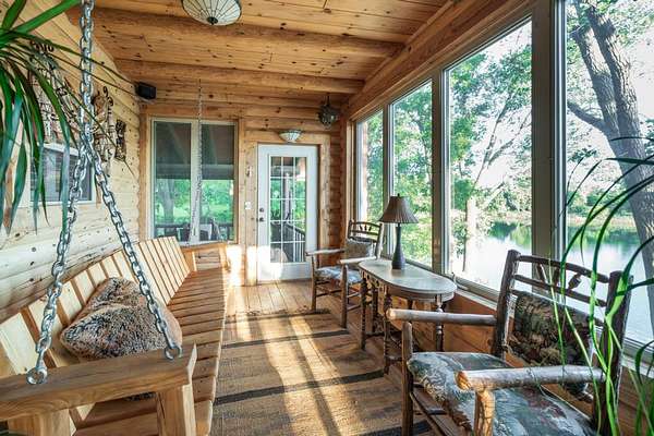 The open concept on the main floor effortlessly blends the kitchen to the dinning area featuring a large custom table. There is also a enclosed porch and sun room just off of the kitchen that overlooks the lake and provides great, passive solar heat for the cabin.