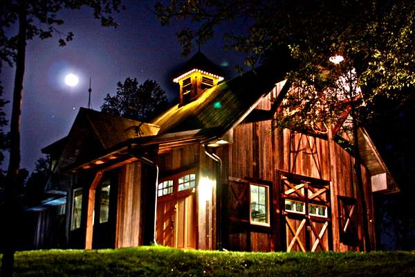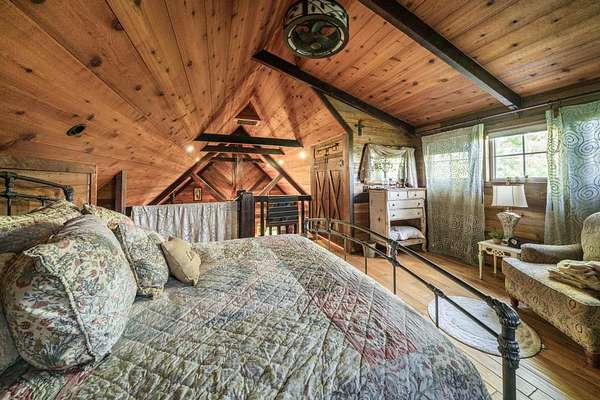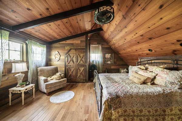 The interior of The Barn features one bedroom and one lofted sleeping area that has it's own large closet and laundry facilities, along with one full bathroom. The eclectic nature of the finishes, which displays beautiful reclaimed lumber from three previous barns. A uniqueness grabs your eyes as you discover curiosities that fill every room. These materials and the decor will have your eyes darting in all directions to try and see what is next. It is expertly put together and crafted throughout the house. The vaulted ceiling in the sitting area looms over the huge "Knights Of The Roundtable" centerpiece. This table has been used for large dinner parties and is also perfect for hosting corporate retreats where all who are involved can easily see and communicate everyone else.