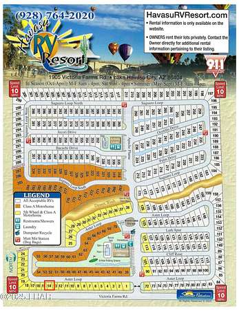 Enjoy living the high life at Havasu RV Resort where you own your deeded lot! This community is fun filled with loads of amenities. This spacious lot features full hook-ups with 100 amp service on a concrete pad. The beautiful resort offers a clubhouse, heated pools, spas, showers, game room, fitness center, bocce ball court, putting green, horseshoe pits, 2 laundry facilities, and so much more! Cable TV and high-speed internet services can be obtained at your site thru local service providers. Community offers full calendar of events including craft, exercise classes, line dancing, water aerobics, card & board games, and so much more! Don't miss this opportunity.