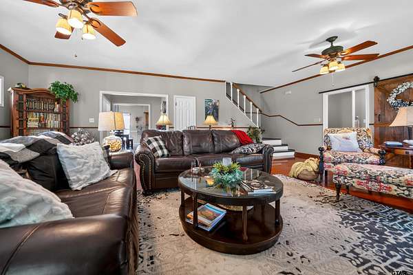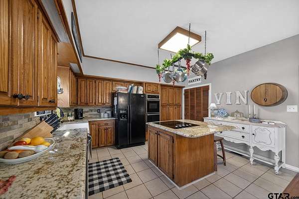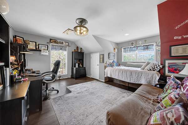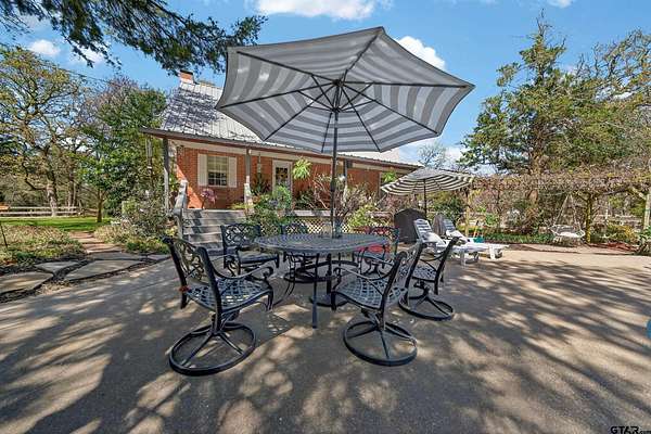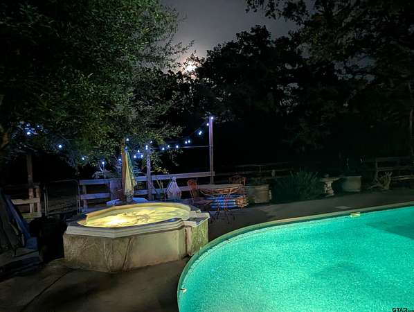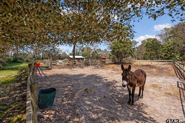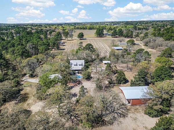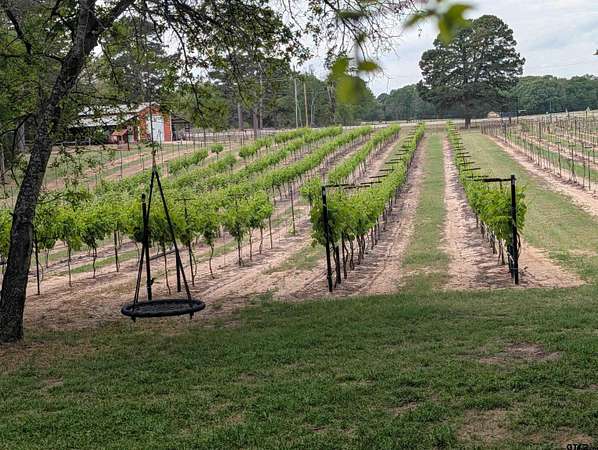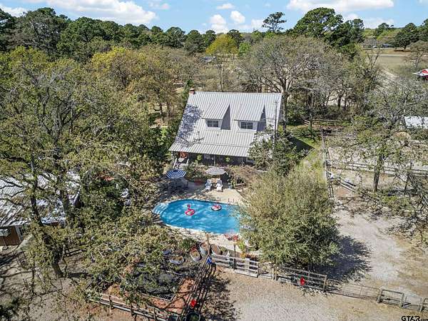 This privately gated 24.82 acre estate offers a rare combination of luxury, utility and natural beauty - all located just minutes from Lindale and award winning Lindale ISD. This 2700 sqft home features 4 bedrooms and 3 bathrooms with a beautiful combination of hardwood and tile flooring throughout and a 3-car detached garage. Second story primary has large walk-in shower and separate garden tub. The heart of the home is a spacious living area featuring a wood-burning fireplace with a custom live-edge mantel. This space flows into a combination kitchen dining area equipped with a spacious island with cooktop, double oven and walk-in pantry. Relax on the inviting covered porches. The front porch offers views of a lush 2 1/2 acre vineyard, while the back porch overlooks the in-ground pool and spa. The property is a nature lover's dream with abundance of wildlife and anchored by a live year-round flowing creek, its own water 580 ft water well and 362 ft of road frontage. key highlights: dream 40x60 workshop, 20x35 barn with lean-tos, loafing shed, and chicken coop complete with chickens. Property is fenced and crossfenced ready for your animals. Updates: Two recently added high efficiency heat pump systems, fresh int and ext paint, many new windows installed, and new water well pump.