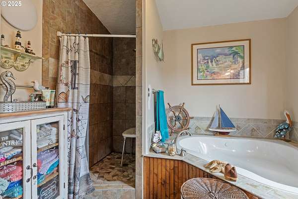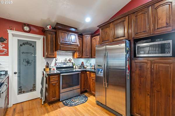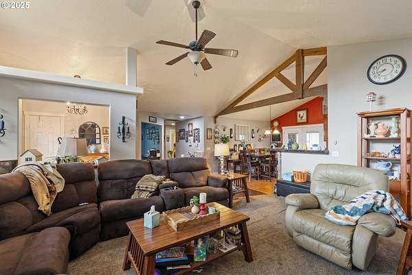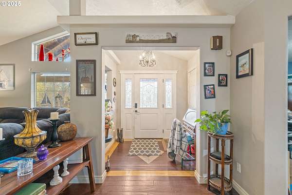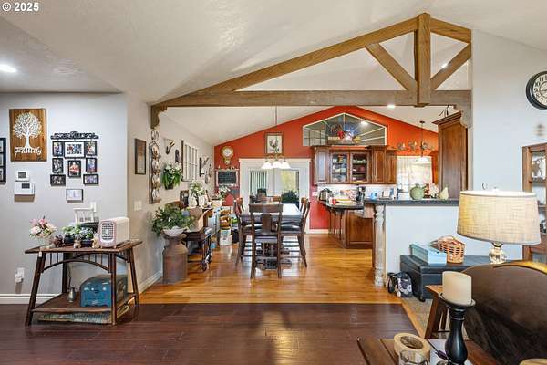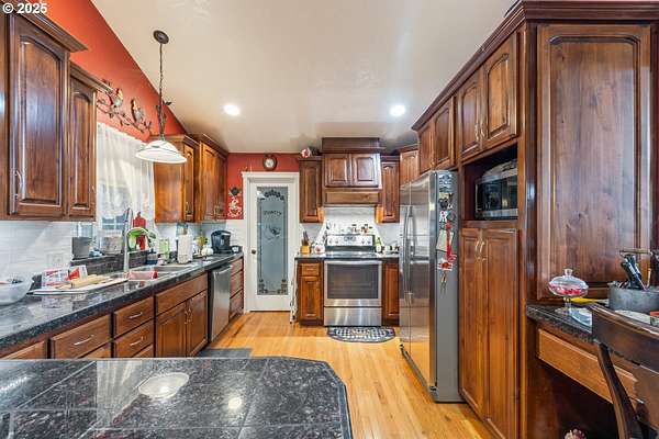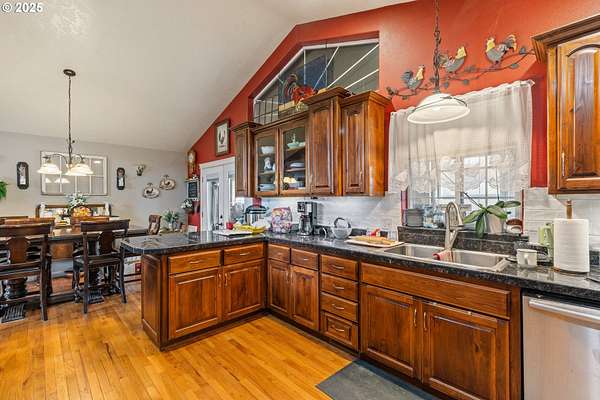 Charming 3-bedroom, 2-bath home on 1.66 acres in Sutherlin, offering the perfect balance of comfort,and style. This thoughtfully designed home features beautiful hardwood floors and a spacious, well-appointed kitchen complete with high-end cabinetry, a large walk-in pantry, and granite countertops, creating an ideal space for cooking and entertaining. The open and inviting floor plan provides a seamless flow between the living, dining, and kitchen areas, perfect for both everyday living and hosting guests. The primary suite offers a relaxing retreat with a large soaking tub and walk-in shower. A dedicated office with a connecting room provides flexible space suited for hobbies, or crafts. The large attached garage offers exceptional versatility, featuring upstairs living quarters with a bathroom and plumbing ready for a kitchenette, making it ideal for guest accommodations, multigenerational living. Outdoors, the expansive acreage provides ample room for small farm animals, gardening, or outdoor recreation. A scenic pond enhances the property, creating a peaceful natural setting where you can relax and enjoy the surrounding beauty. Conveniently located just minutes from town, this property offers the rare opportunity to enjoy a country lifestyle without sacrificing accessibility to local amenities.