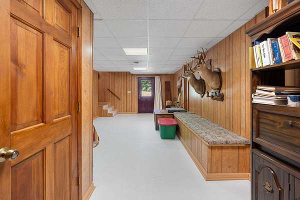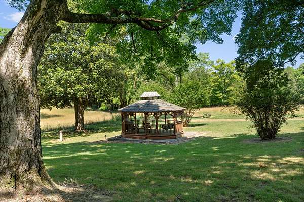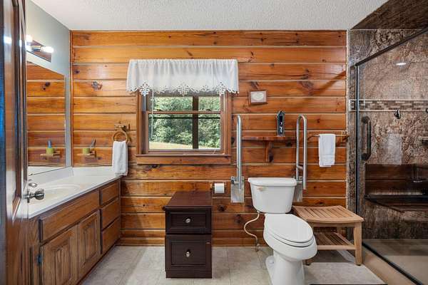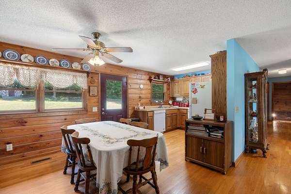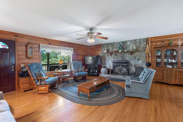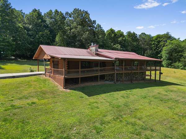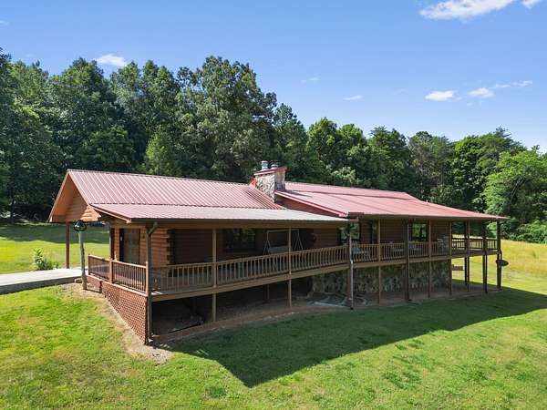 Extraordinary family estate, nestled on 12.28 acres of serene and secluded land. This unique log home was designed with impeccable attention to detail and surrounded by the tranquility of nature. With over 2,000 sq ft this charming log home features a gorgeous stone foundation, a stone fireplace, and a handicap accessible design. It features an open concept living and dining room an amazing walk in shower in the owner's suite, gorgeous hardwood floors throughout and tons of storage in the basement area, along with a bedroom, a full bathroom and large living room/ game room or den. The wrap around covered porch offers views of mature maple and oak trees, while the front porch overlooks the gazebo. It also has a separate pole barn and another separate garage/ shop that has a half bath. It has a private gated entry and room to roam! The only thing missing is your name on the mailbox!!
