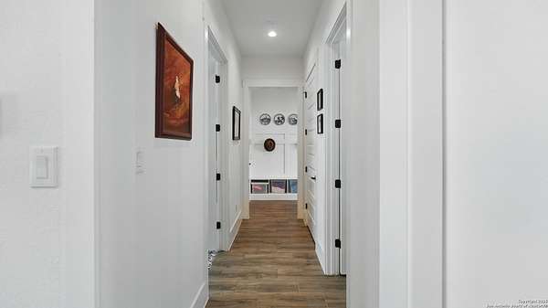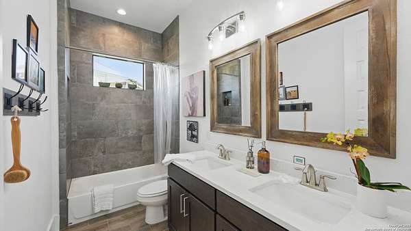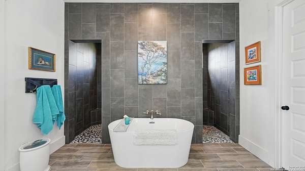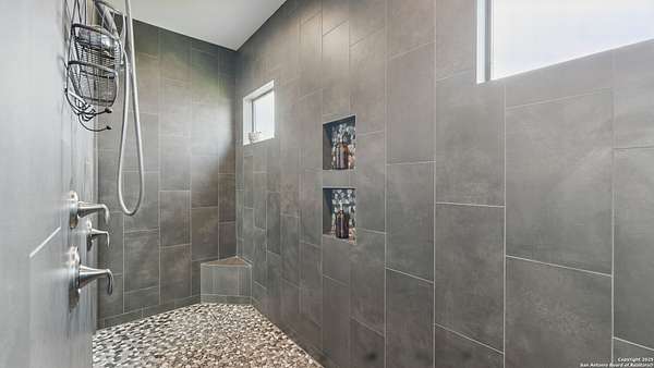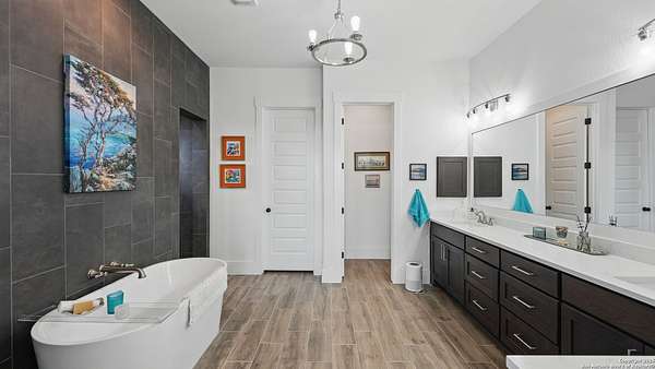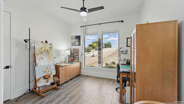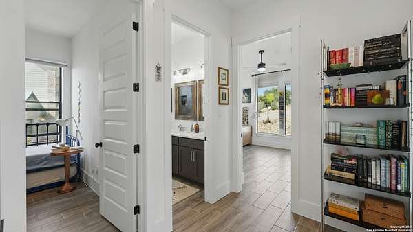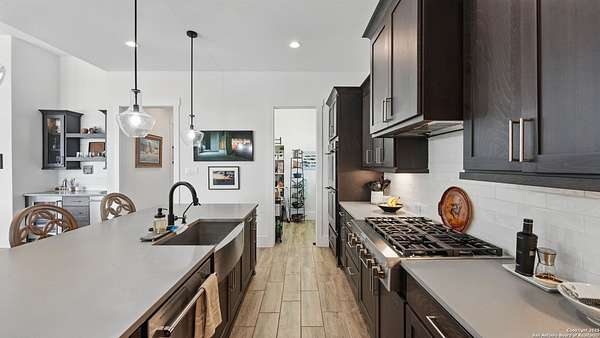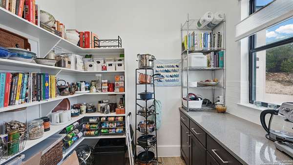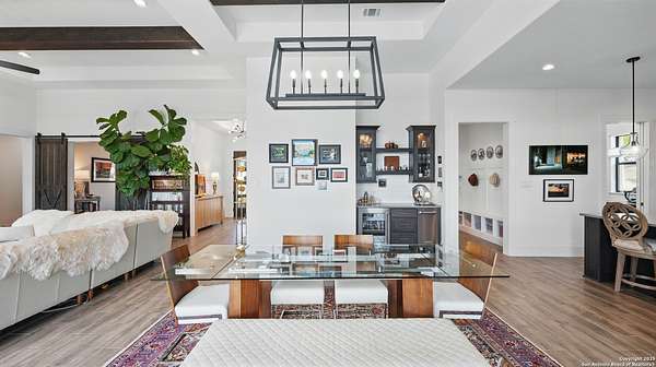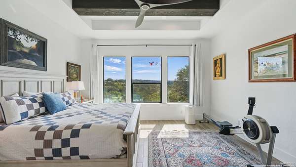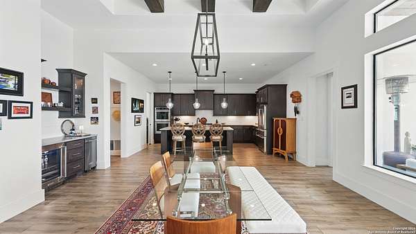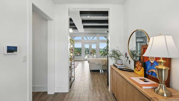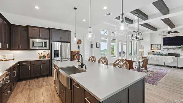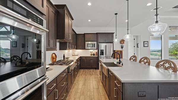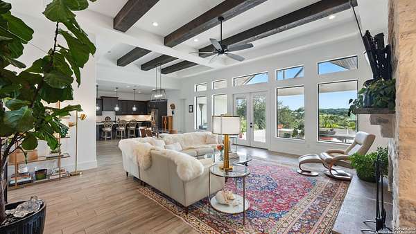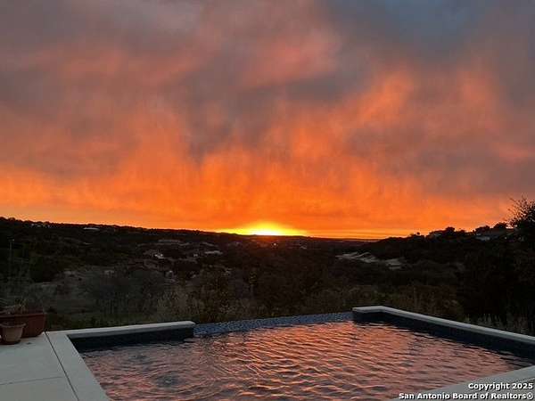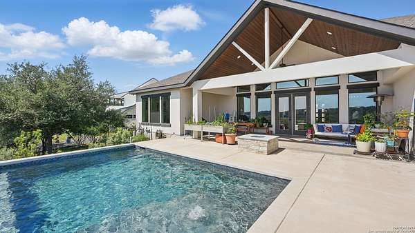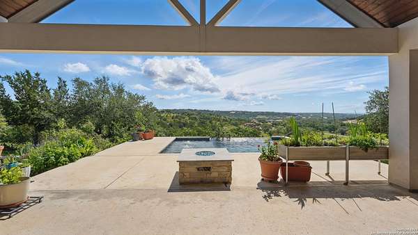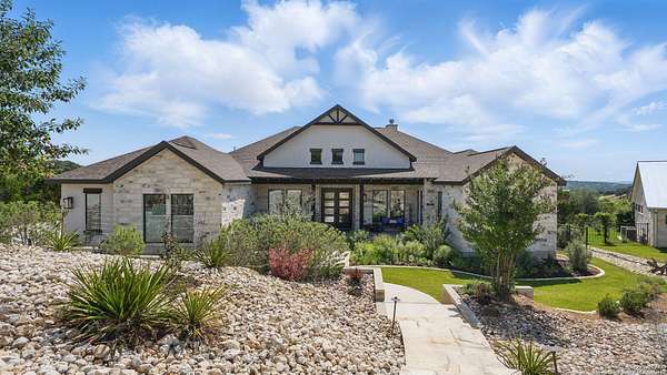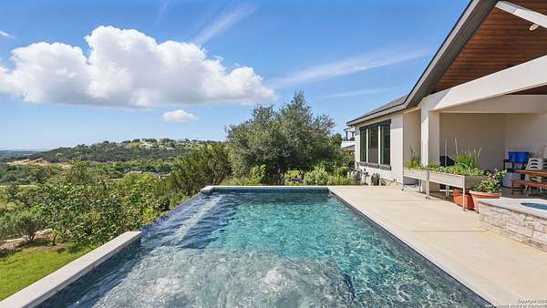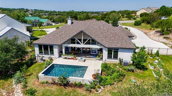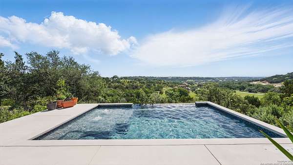 Discover elegant Texas Hill Country living in this stunning 4-bedroom, 3.5-bath custom home with a pool and incredible views. Nestled on a quiet cul-de-sac in the coveted Mystic Shores at Canyon Lake community. Situated on a sprawling 3.29-acre lot with views for miles and a custom infinity edge pool, this property offers the perfect blend of luxury, functionality, and natural beauty. Step inside to over 3,100sqft of single story living space. An open-concept layout features wood-look ceramic tile throughout, soaring ceilings with wood beams, and a cozy gas fireplace. The main living areas and master suite offer expansive views of Canyon Lake and the rolling Hill Country, bringing nature's beauty indoors. The gourmet kitchen is a chef's dream with an oversized gas stove, KitchenAid stainless appliances, double ovens, a walk-in butler's pantry, and a large island perfect for entertaining. A dedicated bar area includes a beverage fridge and an additional ice maker for effortless hosting. Escape to the luxurious primary suite, featuring a tray ceiling with wood beam accents and breathtaking backyard views. The spa-like ensuite bath offers dual vanities, an oversized soaking tub, and a dual-entry walk-through shower with double showerheads and a rain feature, and a large walk-in closet with ample storage. 3 additional bedrooms and 2 more full baths offer tons of space for families or guest suites. A separate office/den provides the ideal work-from-home space, while the oversized laundry room includes custom tile and cabinetry and a convenient dog-wash shower. A large double door entry, half bath and a convenient mudroom from the 3-car oversized garage complete the interior of this exquisite home. Outside, unwind under the large covered patio complete with lighting and ceiling fans. Relax by the infinity-edge custom pool overlooking the scenic landscape, or entertain around the gas firepit with fire feature while taking in the awe-inspiring views of Canyon Lake and the hills. A gas stub is in place for your future outdoor kitchen dreams. The backyard offers wrought iron fencing, mature gardens, fruit trees, and raised vegetable beds. A true escape in natural beauty. This home is loaded with extras including dual tankless water heaters, water softener with reverse osmosis system, water purifier, UV filtration system, security system, and more! The private amenities for Mystic Shores residents are endless- 2 community pools, 2 lakeside parks, acres and acres of nature preserve and walking trails, a clubhouse for events with a gym, pickle ball, basketball, volleyball, and tennis courts, a playground, and boat and RV storage. This home truly checks every box for upscale Hill Country living with privacy, space, and panoramic views.